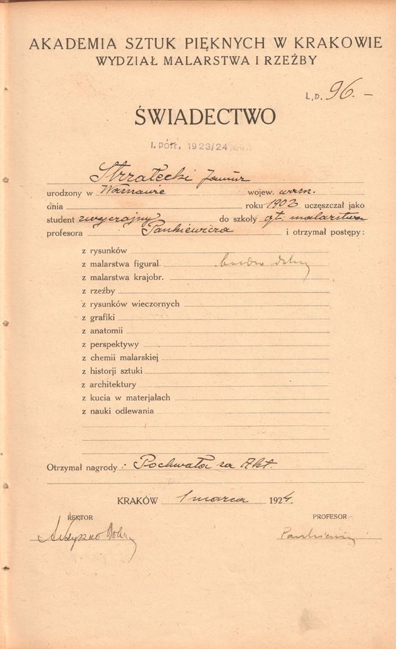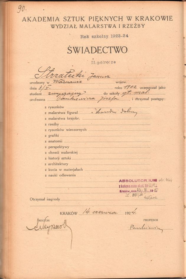 Archiwum ASP w Krakowie, Akademia Sztuk Pięknych w Krakowie, Wydział Malarstwa i Rzeźby, rok szkolny 1923-24, Świadectwo II półrocze Strzałecki Janusz, Absolutorium Nr. 444. (1923-24).