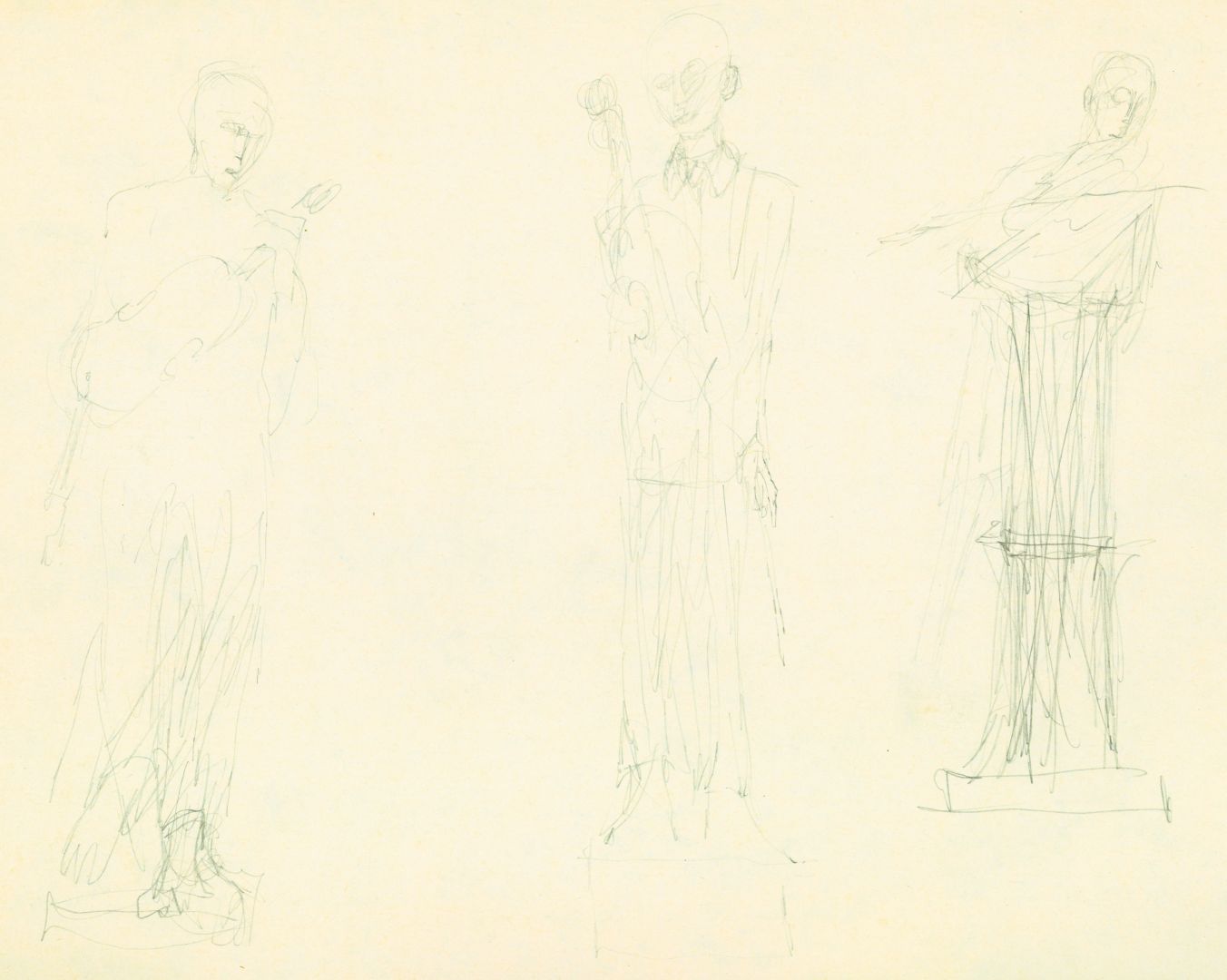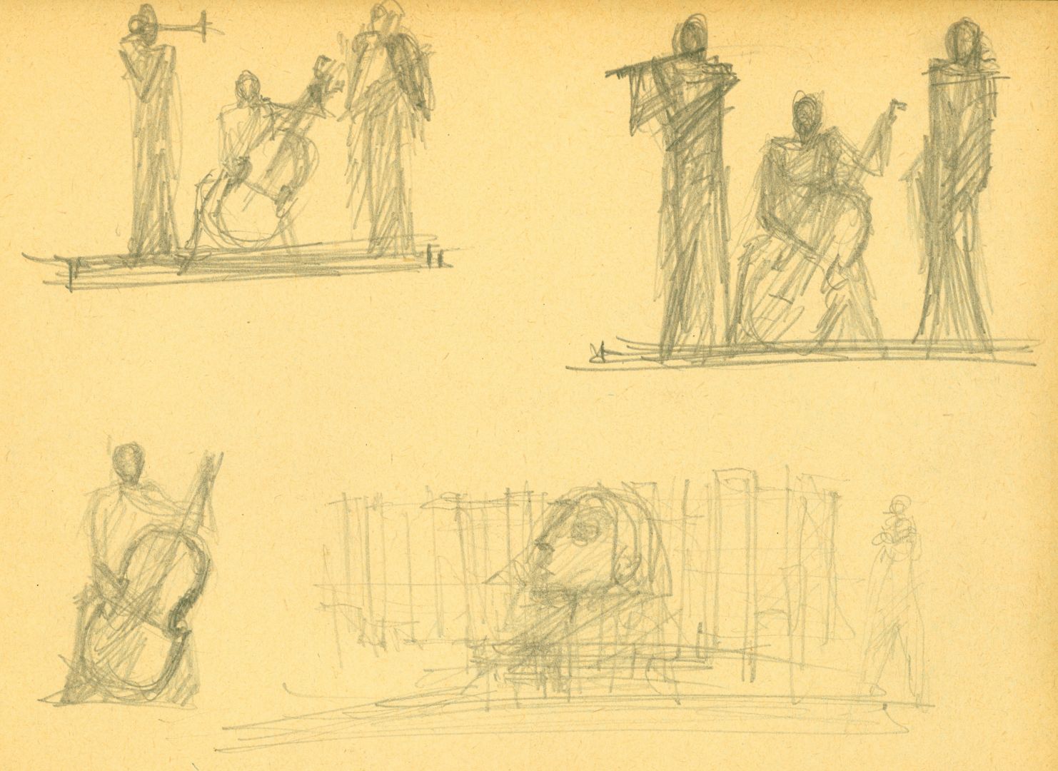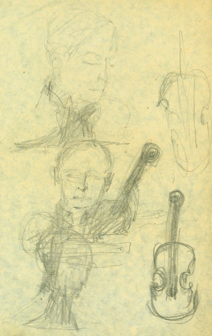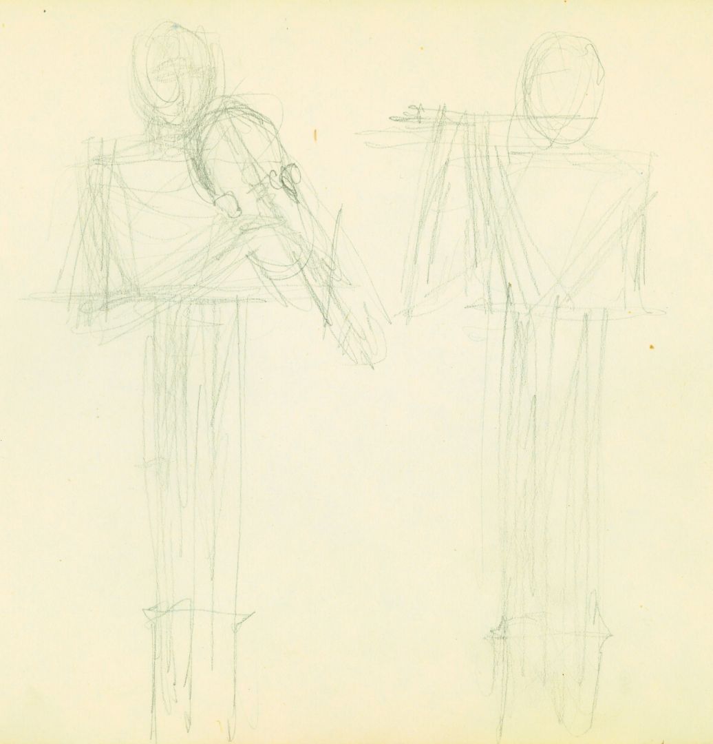 I/B/13 Rysunki przedstawiające postacie stojące i siedzące, z różnymi instrumentami muzycznymi. Prawdopodobnie jest wśród nich projekt zrealizowanej, zaginionej rzeźby dla Filharmonii Bałtyckiej w Gdańsku.