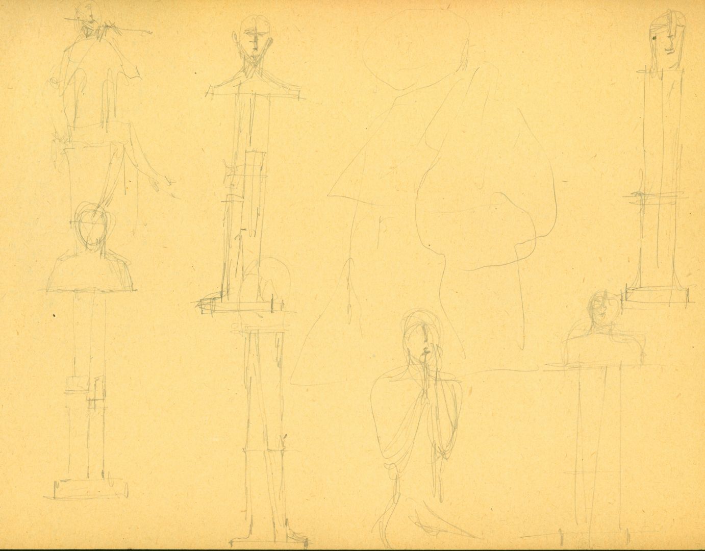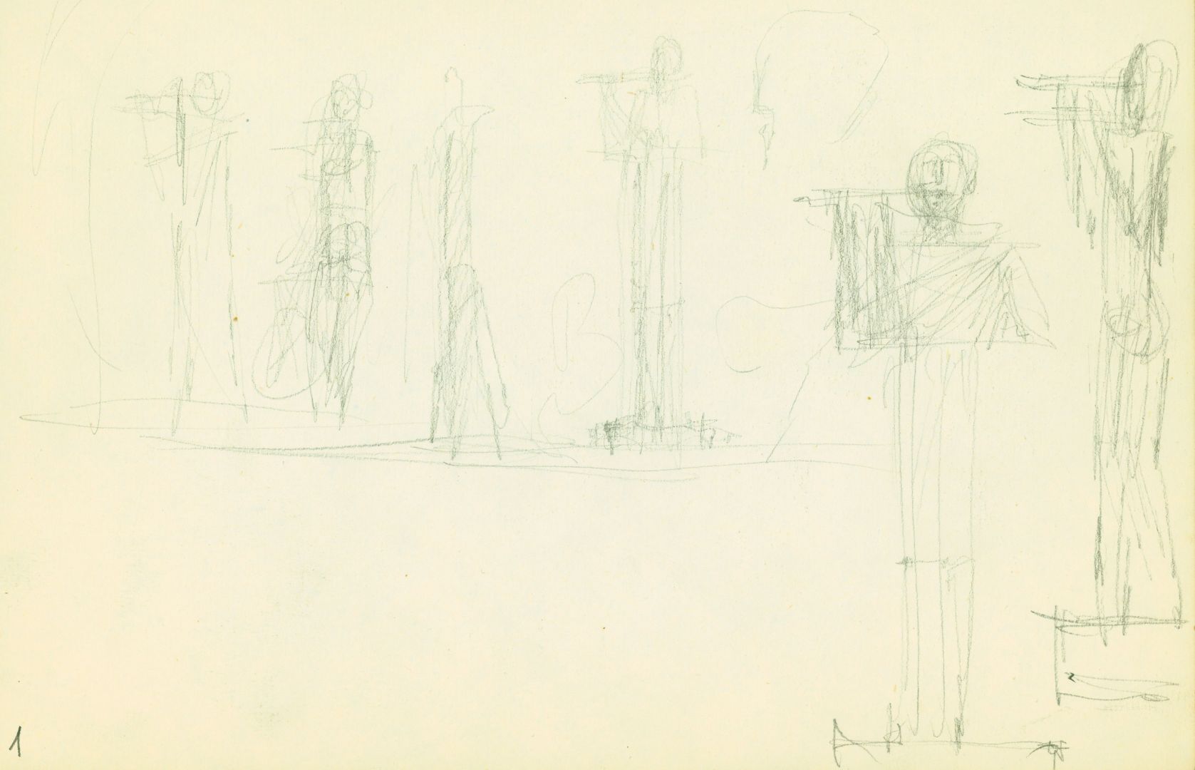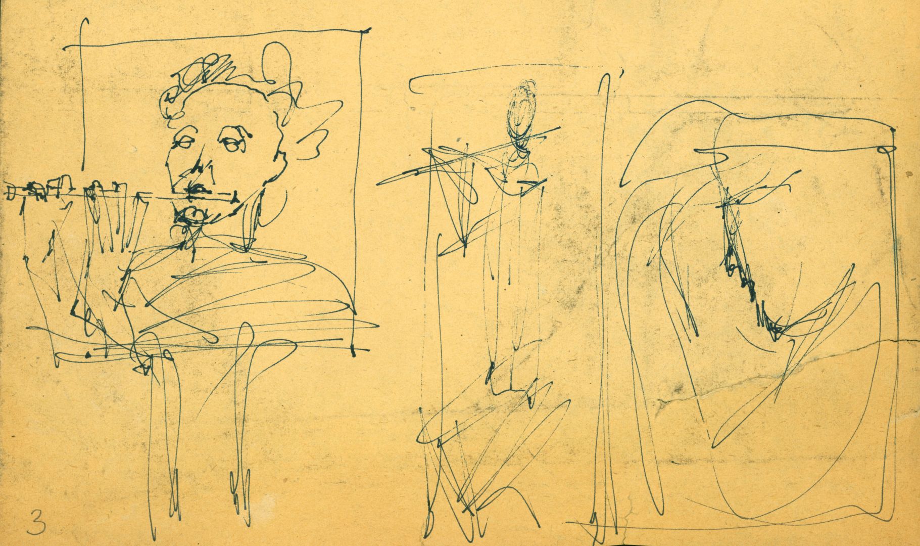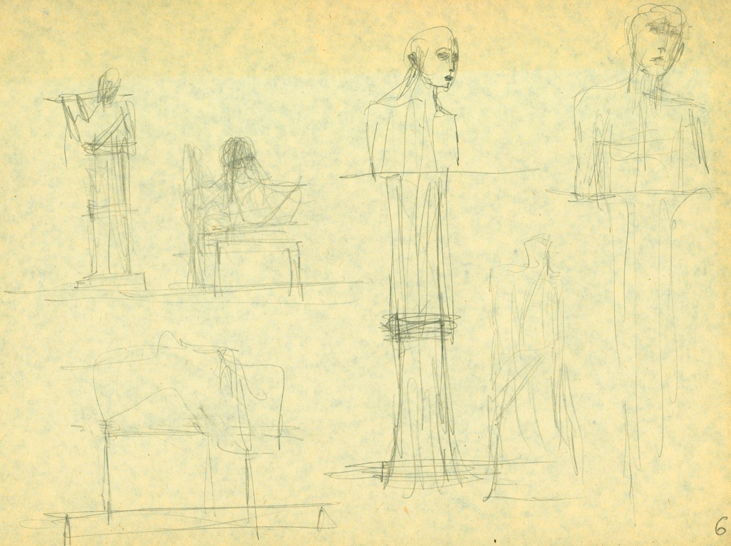 I/B/13 Rysunki przedstawiające postacie stojące i siedzące, z różnymi instrumentami muzycznymi. Prawdopodobnie jest wśród nich projekt zrealizowanej, zaginionej rzeźby dla Filharmonii Bałtyckiej w Gdańsku.