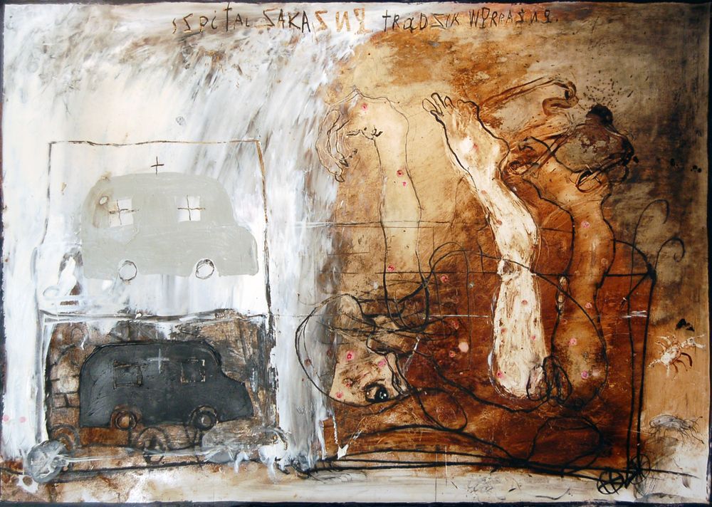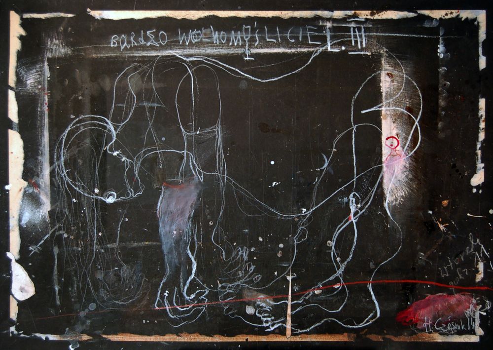 "A frequent motive in Cześnik's drawings and paintings is the hospital room. It is the theatrum mundi that he observed, where the noblest and most despicable things are revealed in a man. Like in a puppet theatre, the characters are guided by Eros and Thanatos. The passing of time, degradation of matter, and thus of people, in Cześnik's work is ubiquitous. (...) In his works, it is not a dangerous memento mori, but a statement. It is so in nature, and it's is not surprising or frightening. The biology of the sheets is clearly visible. As in the Turin Shroud, humanity is visible to them from what Cześnik painted on them." Andrzej Matynia