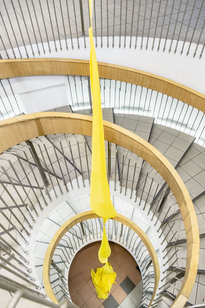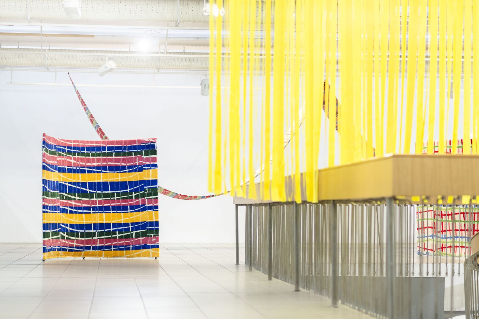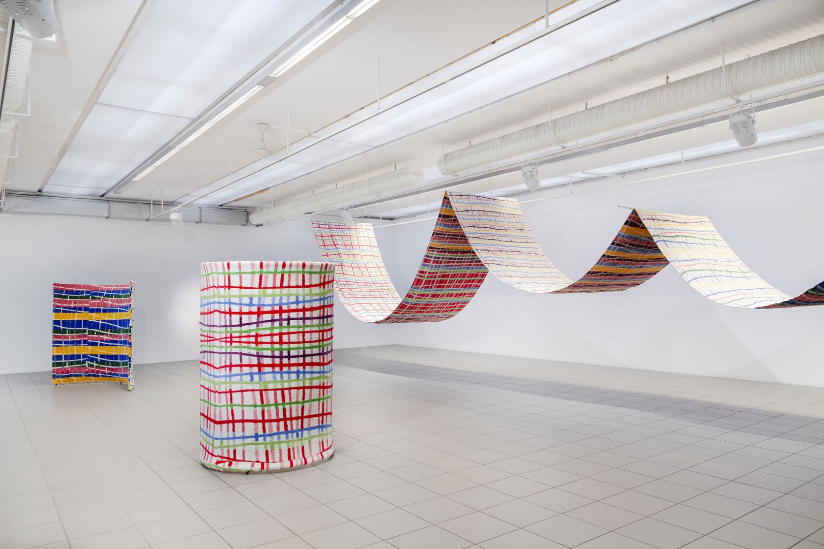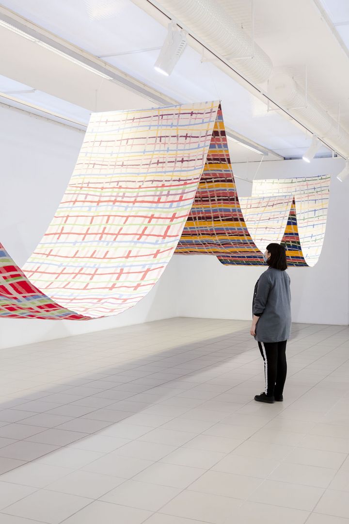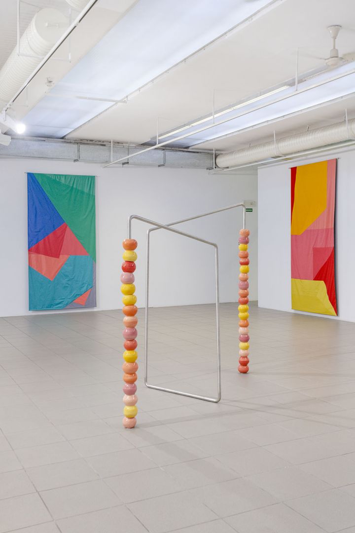 Obiekty odbijają trajektorie ruchu odbiorców: wygięcia, pochylenia, unoszenie głowy, przesuwanie się, wycofywanie i zwalnianie kroku. Dynamika inicjowana przez kolejne podpórki, osie, parawany, obręcze, chorągiewki, drążki, liny składa się na traktat o grawitacji, w którym ciążenie tkanin, opadających i wywijających się na drugą stronę jest wyrazem fascynacji spadaniem ku ziemi, w materię. Zmienne relacje między obiektami poruszanymi prądami powietrza, wzbudzanymi przez ciała odbiorców, powodują, że wystawa nie ma stałych punktów, kołysze się i rozlewa."