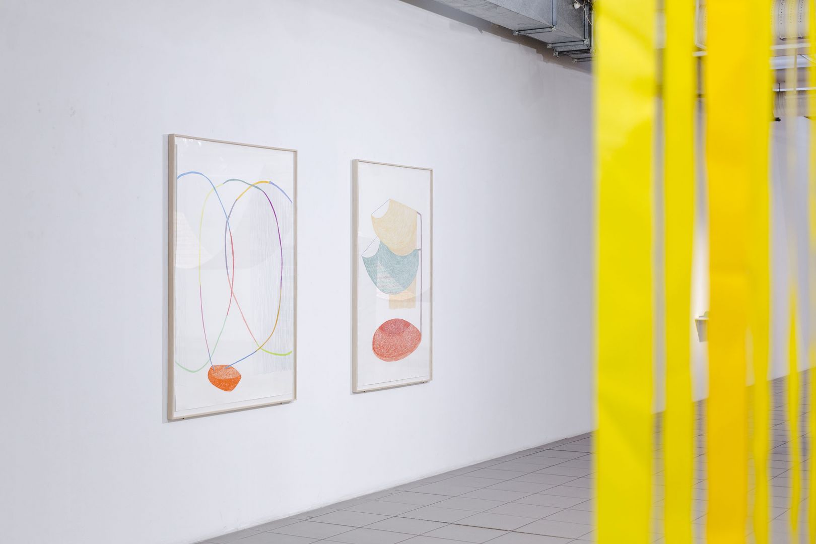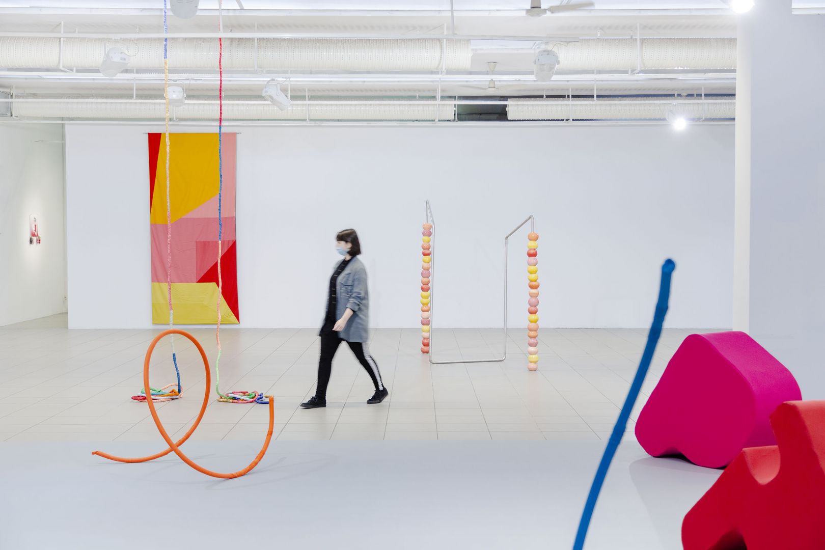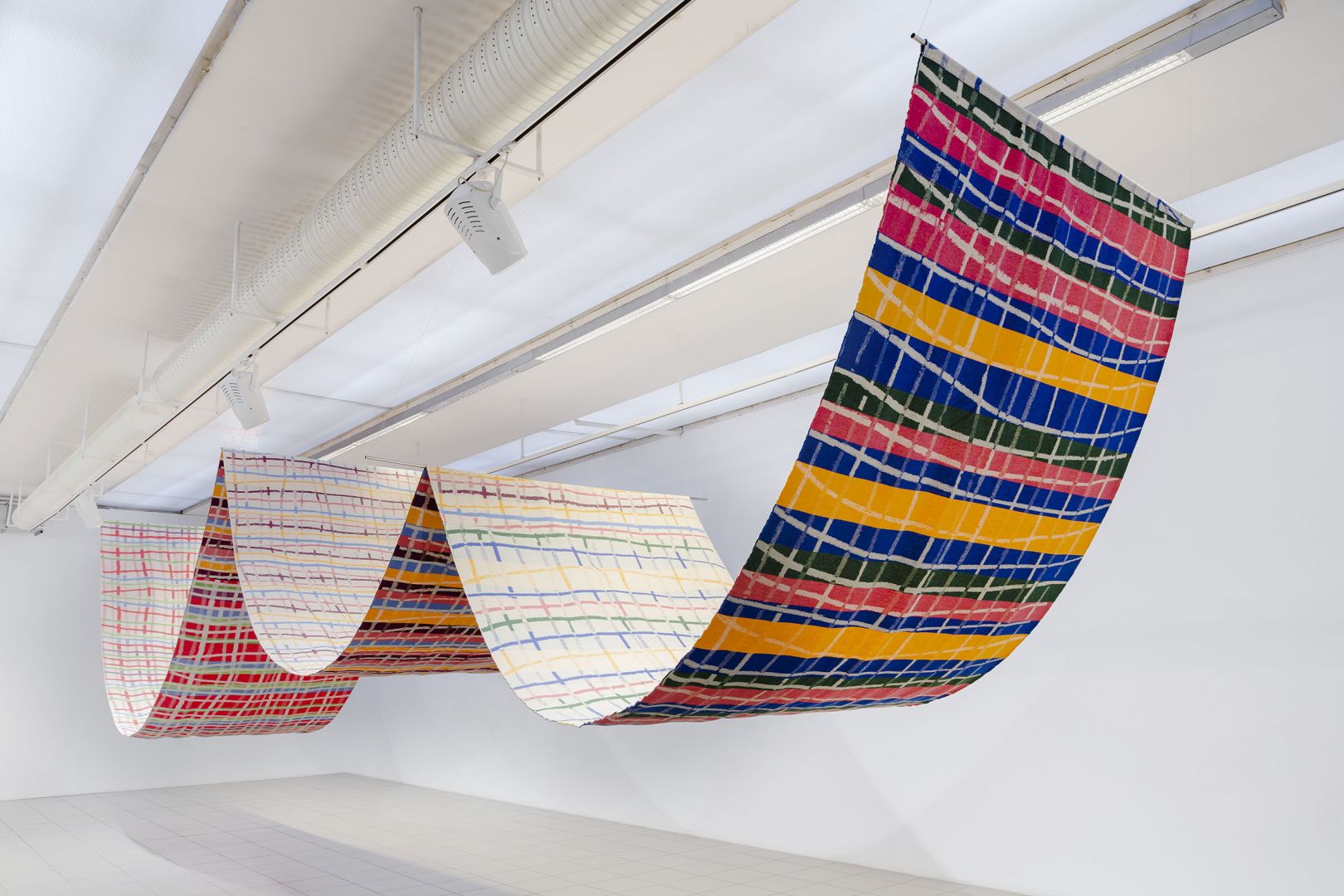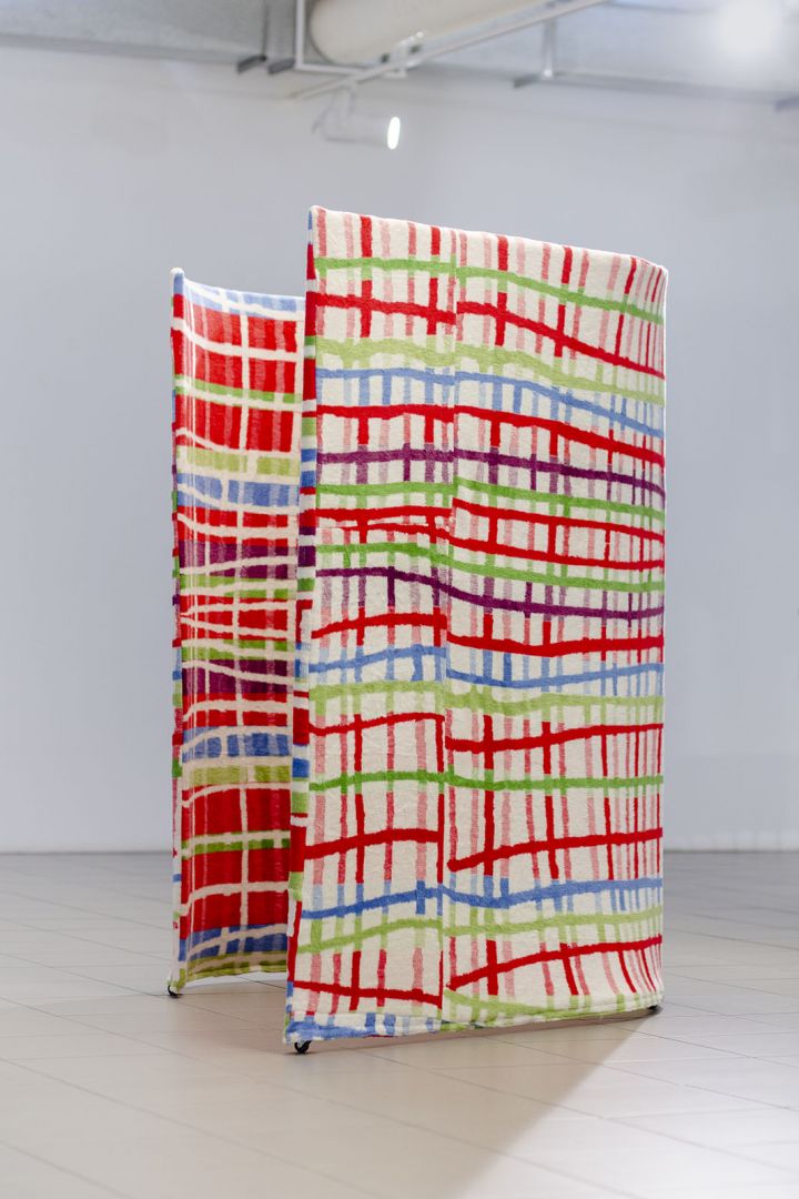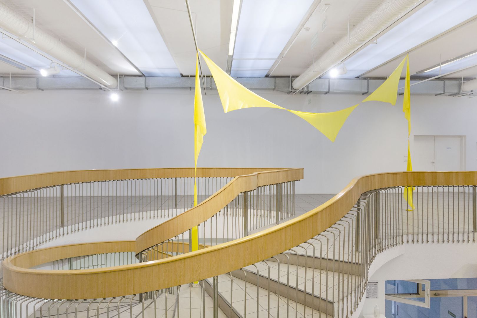 Obiekty odbijają trajektorie ruchu odbiorców: wygięcia, pochylenia, unoszenie głowy, przesuwanie się, wycofywanie i zwalnianie kroku. Dynamika inicjowana przez kolejne podpórki, osie, parawany, obręcze, chorągiewki, drążki, liny składa się na traktat o grawitacji, w którym ciążenie tkanin, opadających i wywijających się na drugą stronę jest wyrazem fascynacji spadaniem ku ziemi, w materię. Zmienne relacje między obiektami poruszanymi prądami powietrza, wzbudzanymi przez ciała odbiorców, powodują, że wystawa nie ma stałych punktów, kołysze się i rozlewa."
