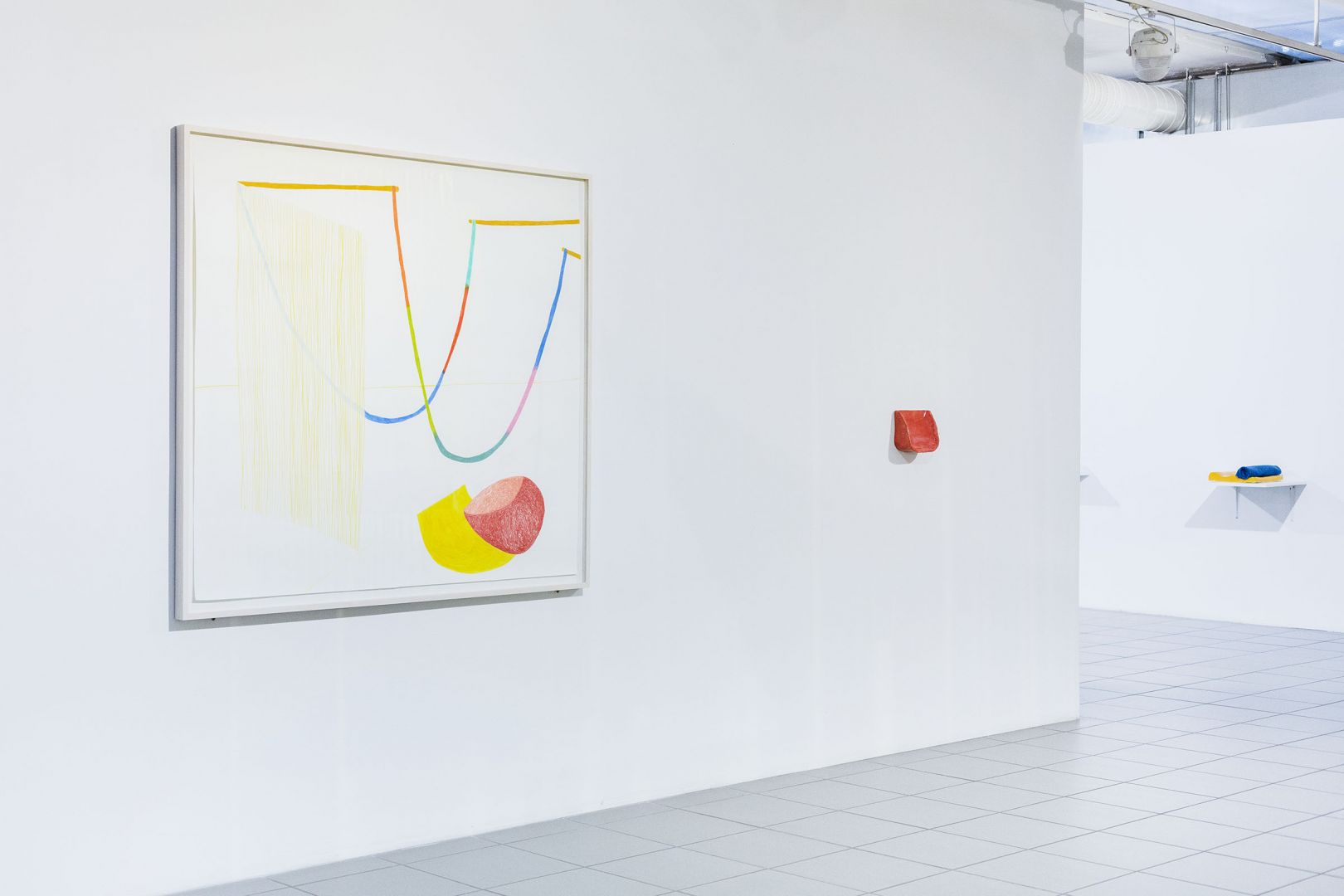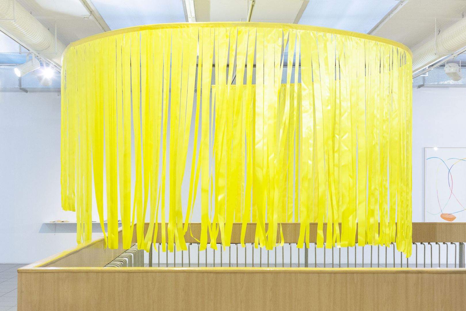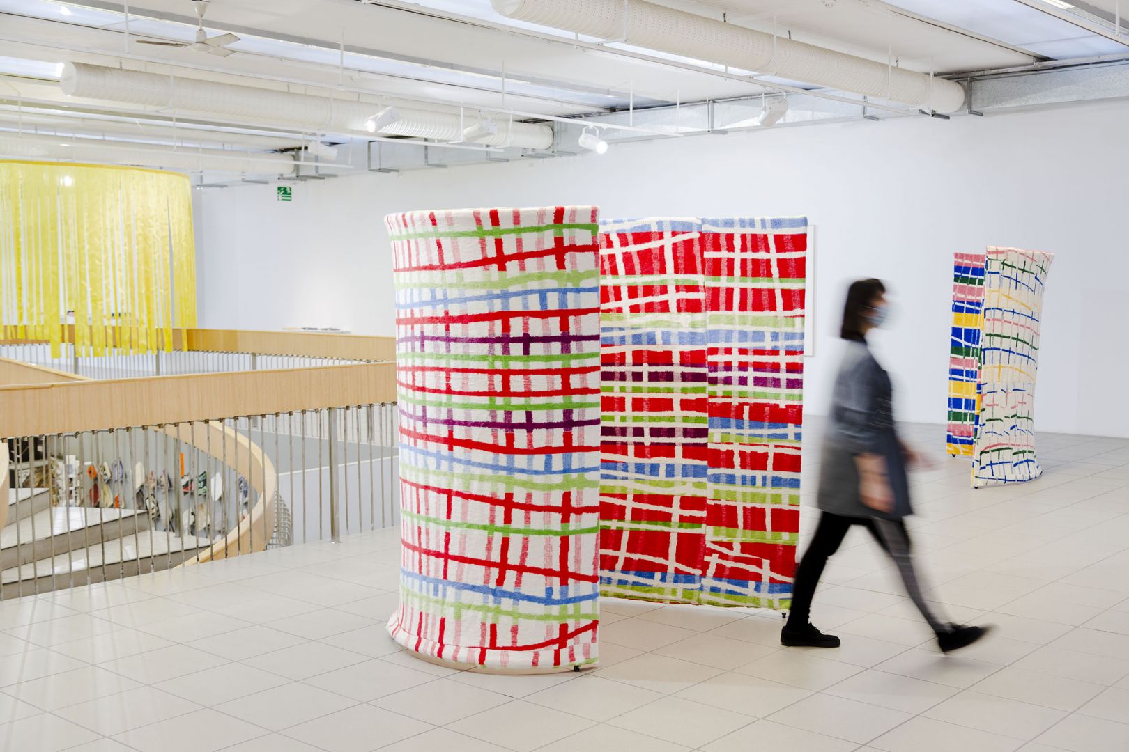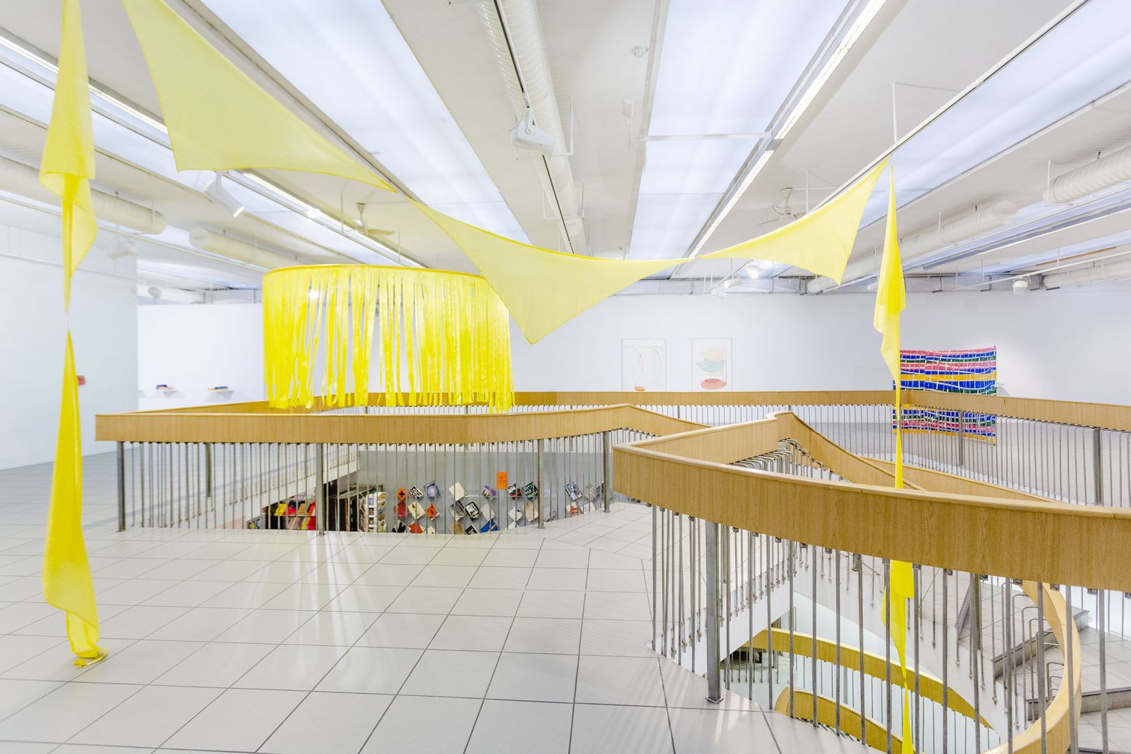 Obiekty odbijają trajektorie ruchu odbiorców: wygięcia, pochylenia, unoszenie głowy, przesuwanie się, wycofywanie i zwalnianie kroku. Dynamika inicjowana przez kolejne podpórki, osie, parawany, obręcze, chorągiewki, drążki, liny składa się na traktat o grawitacji, w którym ciążenie tkanin, opadających i wywijających się na drugą stronę jest wyrazem fascynacji spadaniem ku ziemi, w materię. Zmienne relacje między obiektami poruszanymi prądami powietrza, wzbudzanymi przez ciała odbiorców, powodują, że wystawa nie ma stałych punktów, kołysze się i rozlewa."