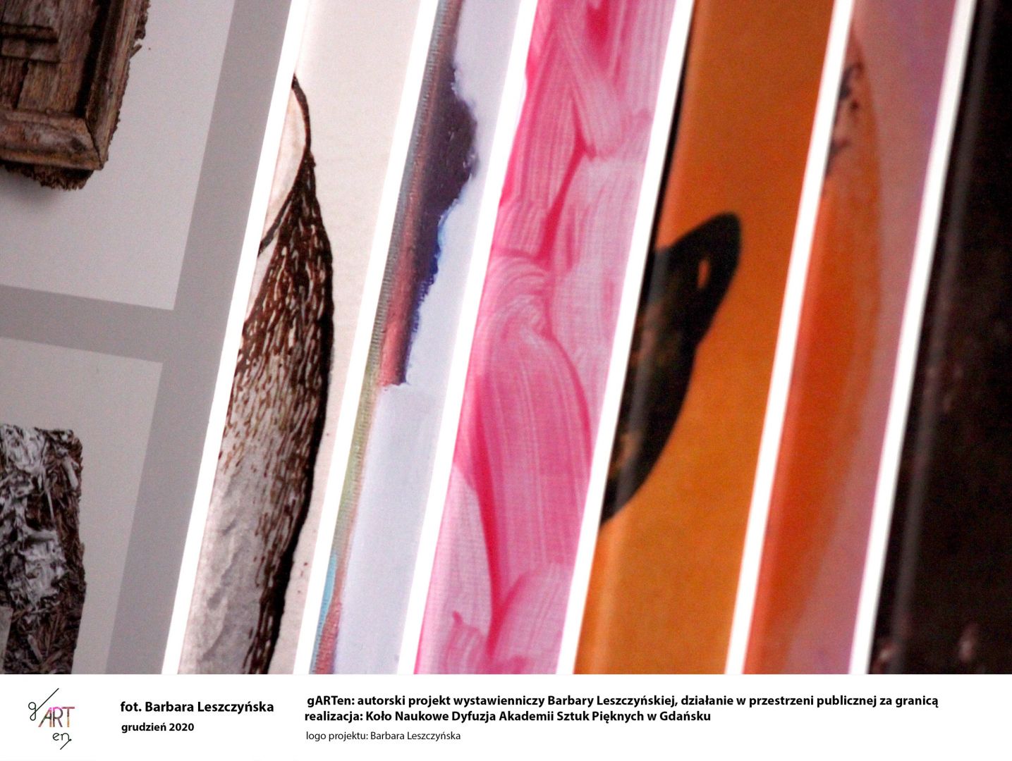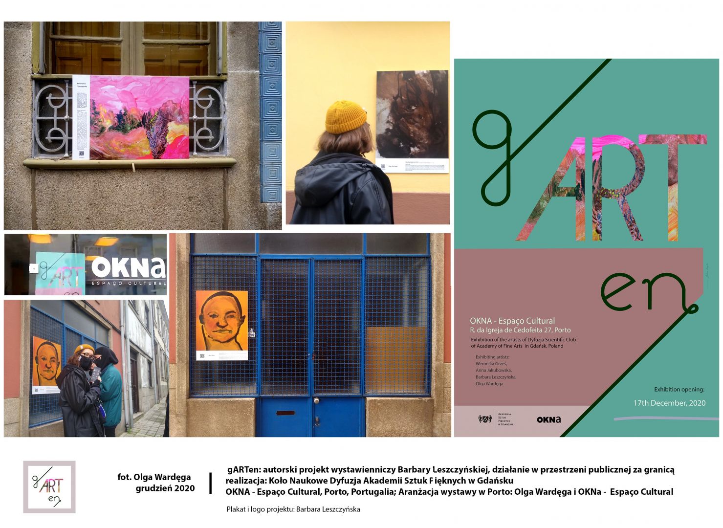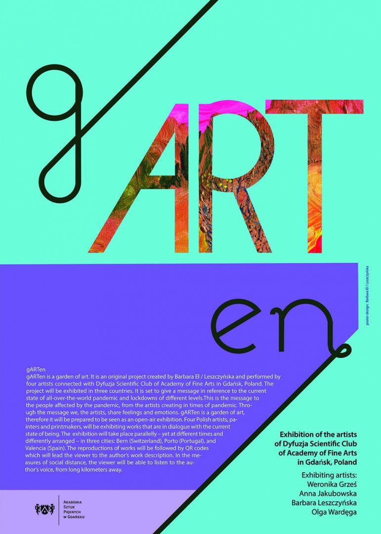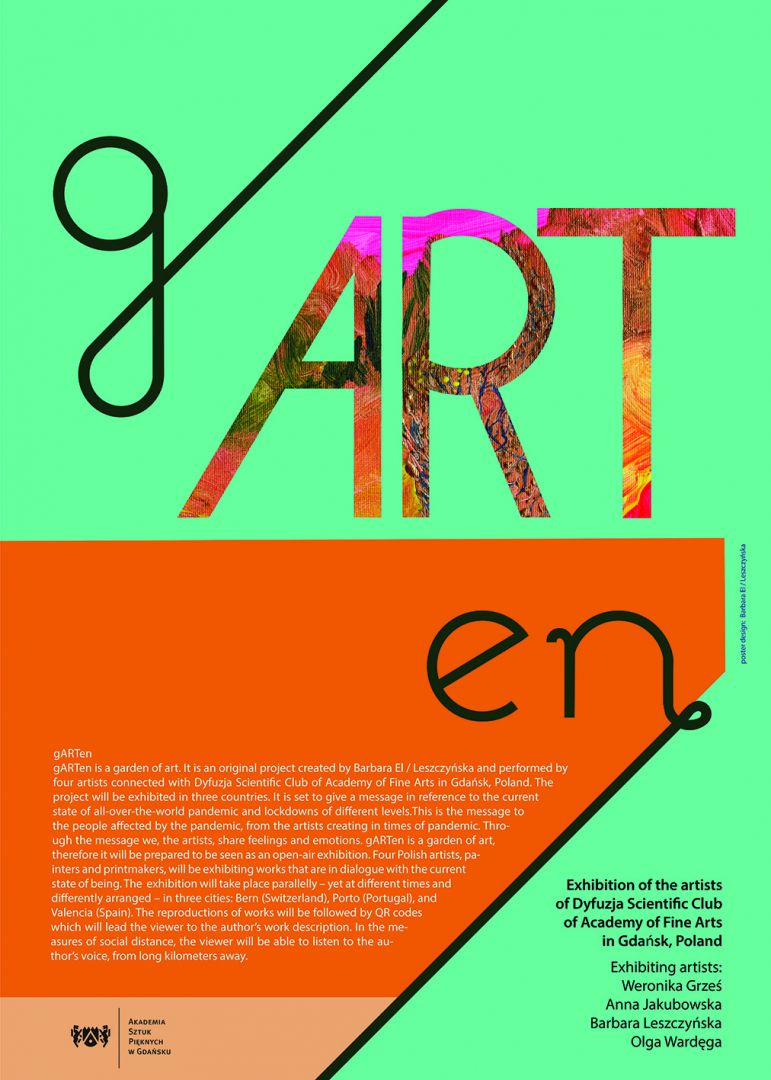 KRÓTKI OPIS: gARTen to projekt autorski Barbary El / Leszczyńskiej. Działanie w założeniu odbywało się w trzech krajach. Powstało, by opowiedzieć historie- stworzyć komunikat w odniesieniu do stanu ogólnoświatowej pandemii i lockdown’ów, które nas dotykają. Jest to wiadomość dla ludzi dotkniętych pandemią, od artystów tworzących w czasach pandemii. Dzielimy się-my artystki-z odbiorcą emocjami, spostrzeżeniami i tym, jak odczuwamy obecną sytuację. Wystawa prezentowana była/będzie równolegle –w innych aranżacjach i w różnych terminach – w trzech miastach: Bernie (Szwajcaria), Porto (Portugalia) i Walencji (Hiszpania).