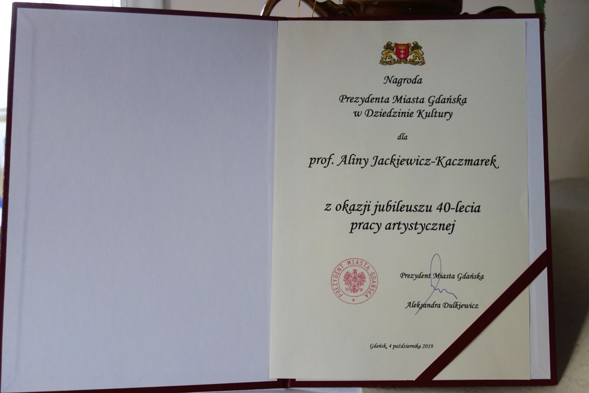 Z przyjemnością informujemy, że dnia 4 października 2019, w Galerii PUNKT Gdańskiego Towarzystwa Przyjaciół Sztuki na wernisażu indywidualnej wystawy grafiki „Od Santorini do Svalbardu" Alina Jackiewicz-Kaczmarek, profesor Akademii Sztuk Pięknych w Gdańsku, otrzymała Nagrodę Prezydenta Miasta Gdańska w Dziedzinie Kultury z okazji jubileuszu 40-lecia pracy artystycznej!