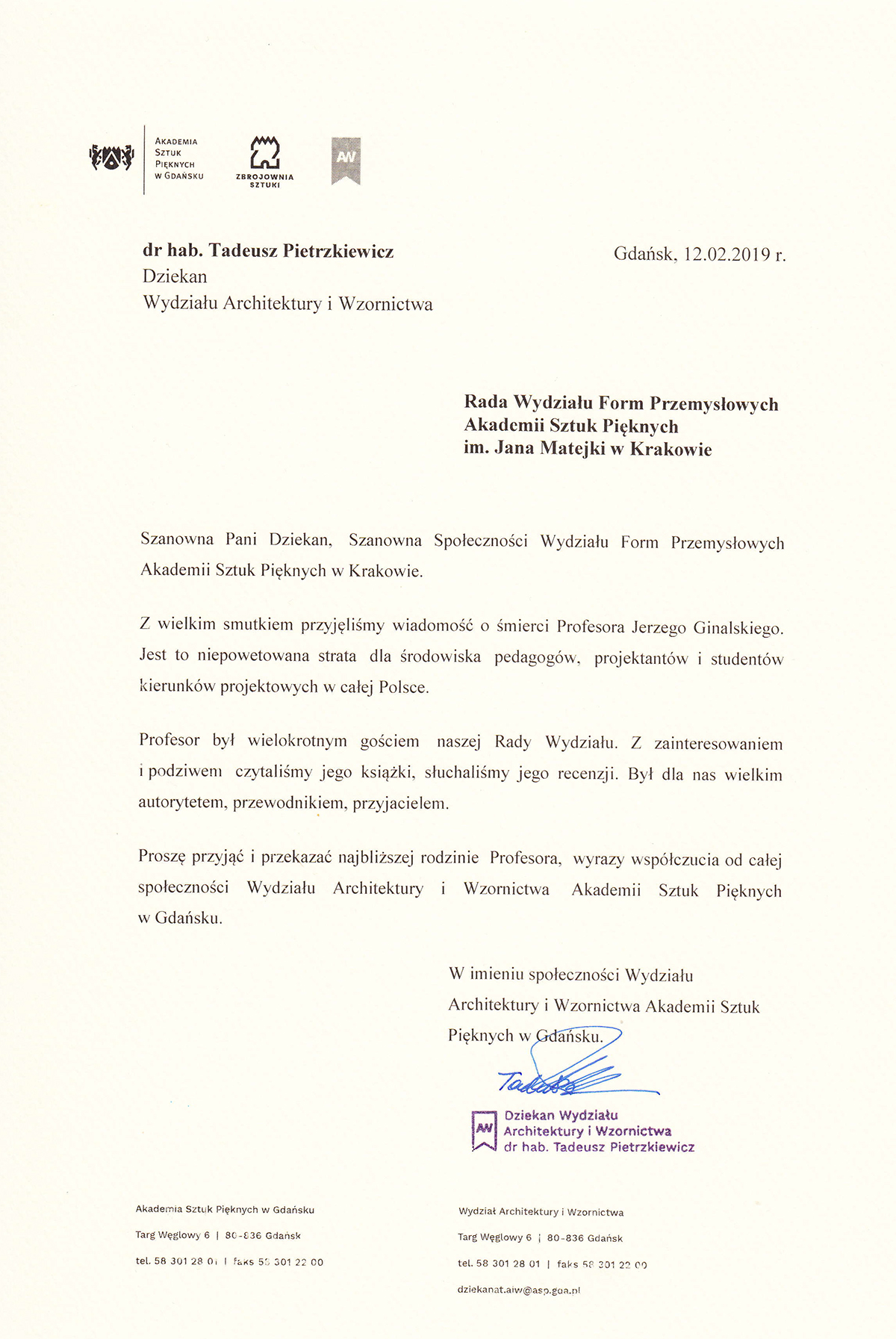 Z przykrością zawiadamiamy, że zmarł prof. dr hab. Jerzy Ginalski, artysta związany z Akademią Sztuk Pięknych im. Jana Matejki w Krakowie.