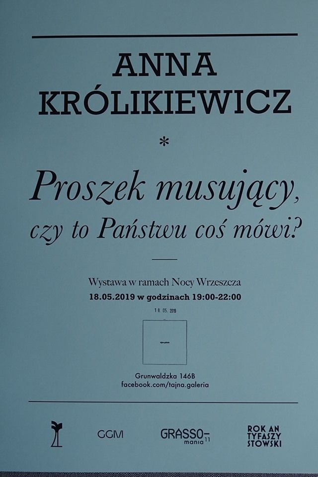 czy tym razem udało się odkryć kamień filozoficzny, ale bez wątpienia pojawił się tajemniczy proszek musujący, kolejny ważny bohater dzieła Grassa. Proszek w „Blaszanym bębenku” to nacechowana erotycznie historia miłości i utraty, symboliczna inicjacja Oskara. Czy proszek musujący w alchemicznej kuchni Anny Królikiewicz jest jedynie efektem ubocznym prac nad materializacją kamienia filozoficznego, czy ich ziszczeniem? Czy tak smakuje odpowiedź na zagadkę świata i materii? Nie ma tutaj oczywistych pytań, tym bardziej brak jasnych odpowiedzi. Proszek musujący. Czy to państwu coś mówi?