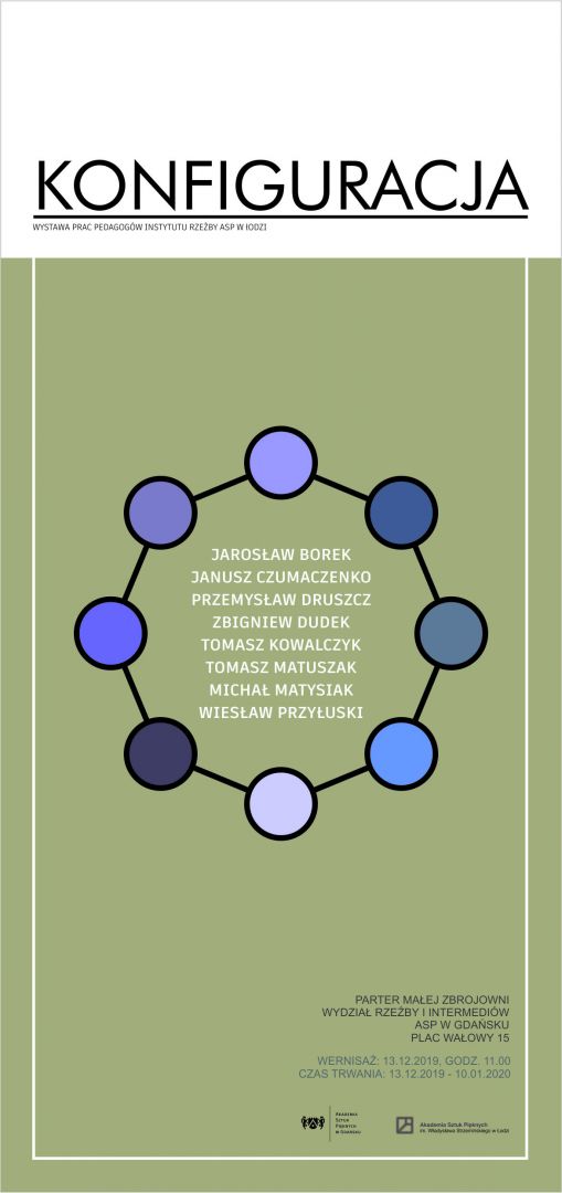 Instytut Rzeźby Wydziału Sztuk Pięknych Akademii Sztuk Pięknych w Łodzi oraz Wydział Rzeźby i Intermediów Akademii Sztuk Pięknych w Gdańsku zapraszają na wernisaż wystawy „KONFIGURACJA. Wystawa prac pedagogów Instytutu Rzeźby ASP w Łodzi”, która odbędzie się w 13 grudnia 2019 r. o godz. 11.00 w Budynku Małej Zbrojowni (Wydział Rzeźby i Intermediów ASP w Gdańsku, Plac Wałowy 15). Wystawa potrwa do 10 stycznia 2020 r.