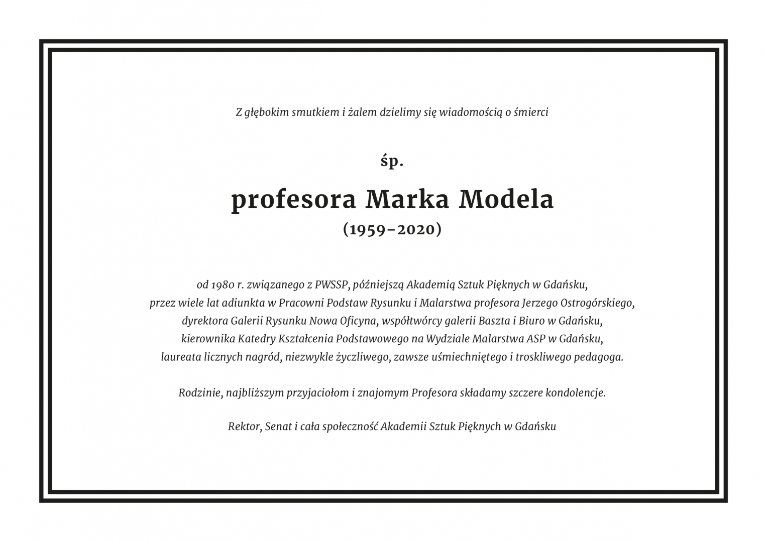 Wydział Malarstwa Akademii Sztuk Pięknych w Gdańsku i społeczność Naszej Alma Mater składa Najbliższym i Przyjaciołom zmarłego Profesora Marka Modela nasze gorące wyrazy głębokiego współczucia. Niech spoczywa w pokoju. Pozostaje pamięć i sztuka.
