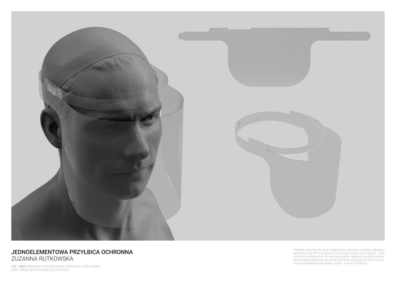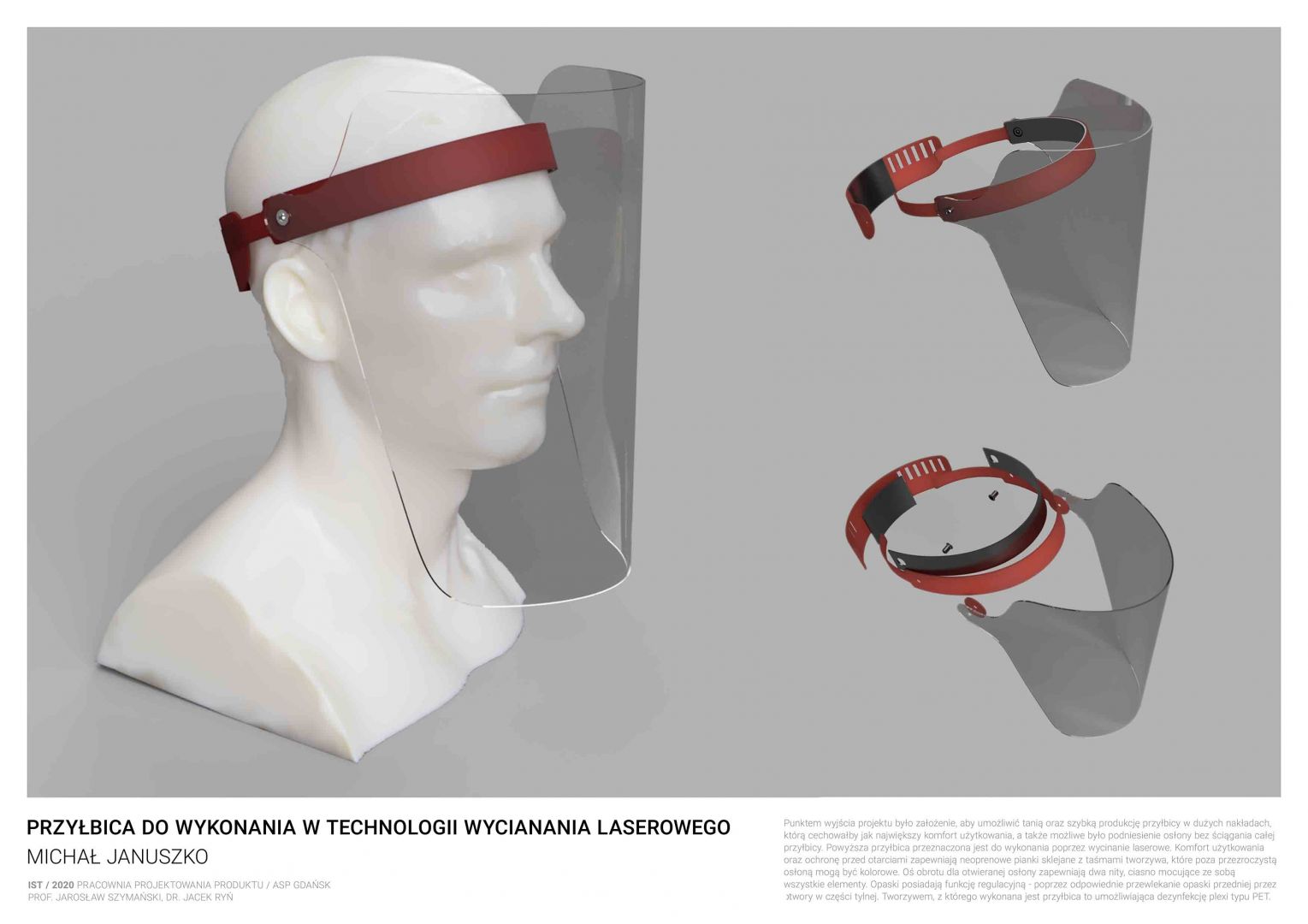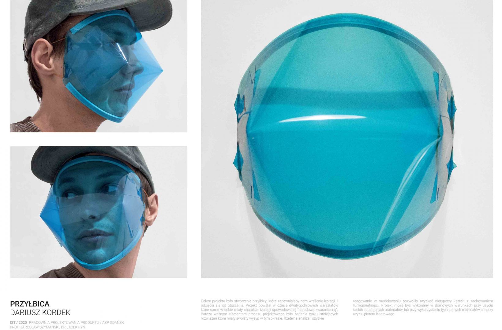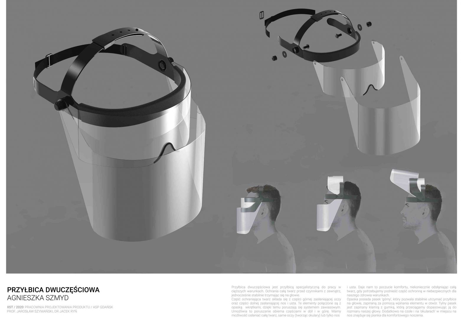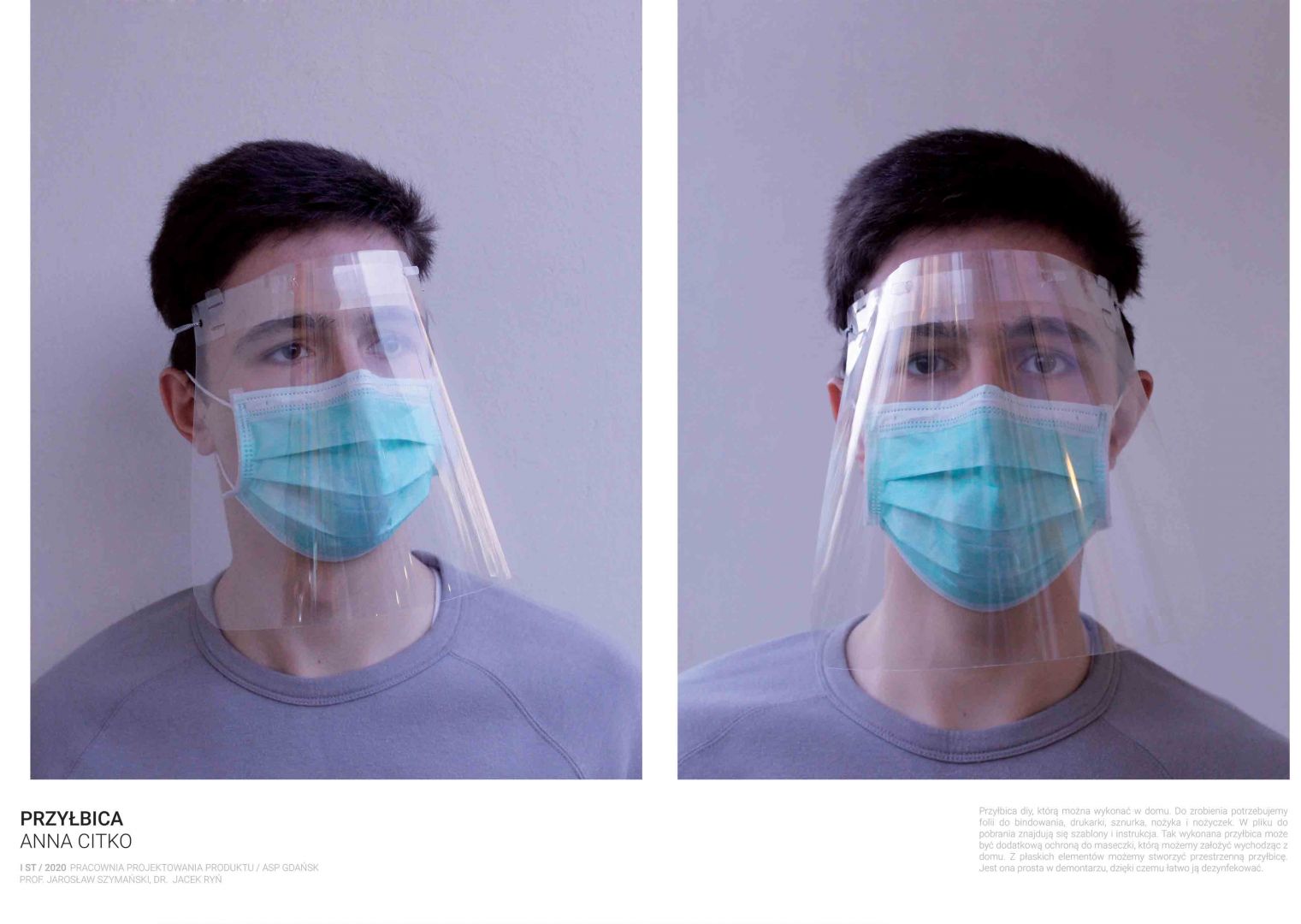 Obecna sytuacja na świecie i w kraju oraz przejście na nauczanie w trybie online otwiera przed nami nowe możliwości. Staramy się być elastyczni i reagować na otaczającą nas rzeczywistość. Ostatnio nasi studenci studiów I stopnia podczas warsztatów w trybie online zaprojektowali przyłbice ochronne. Są to projekty otwarte „open source” do zastosowań niekomercyjnych. Projekty te zostały zrealizowane w pracowni projektowania produktu prowadzonej przez prof. Jarosława Szymańskiego oraz dra Jacka Rynia (Katedra Projektowania Produktu i Usług).