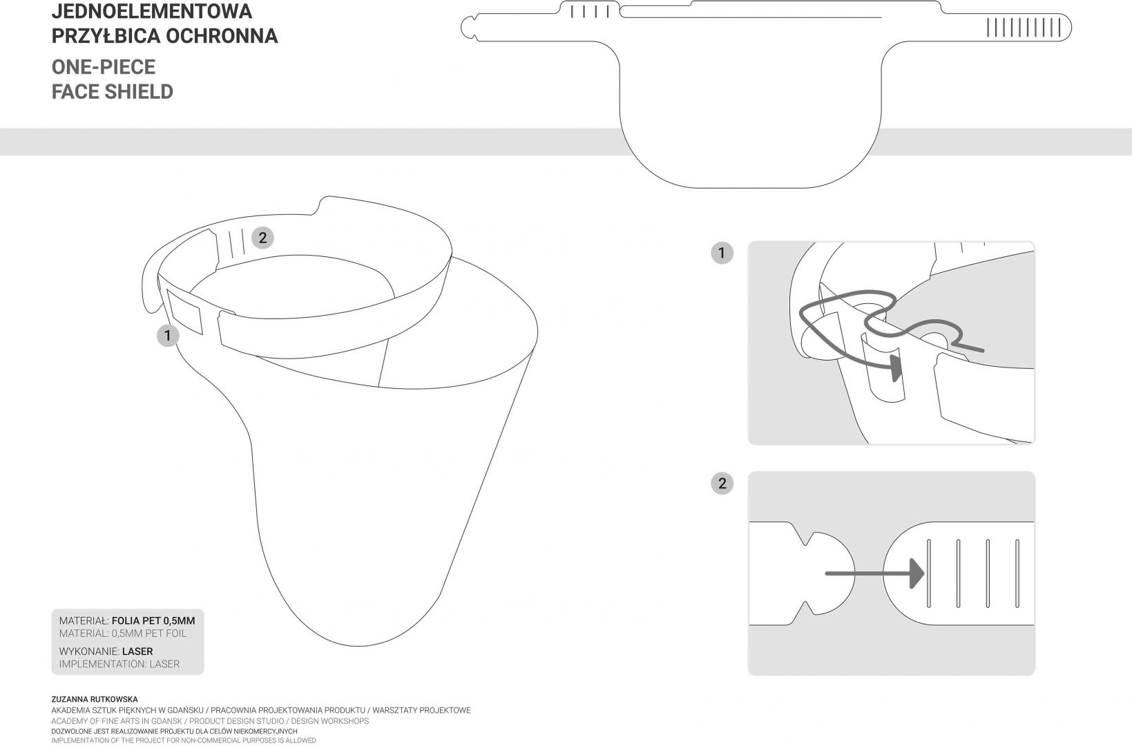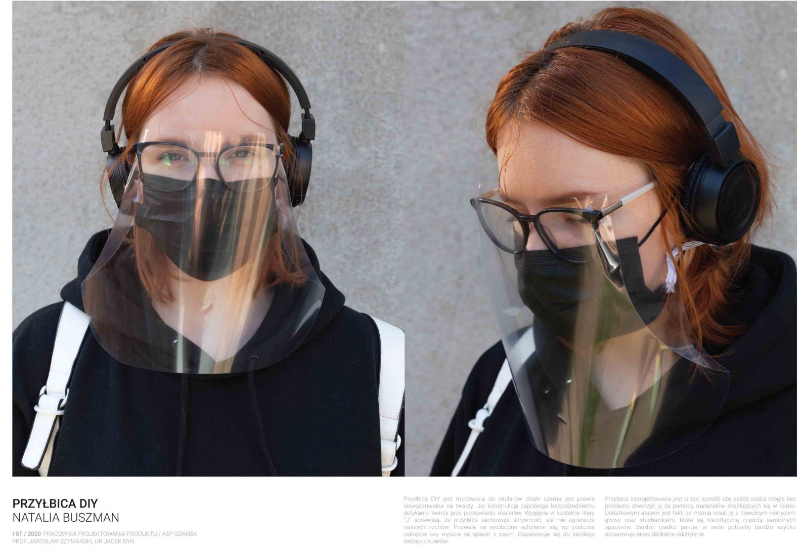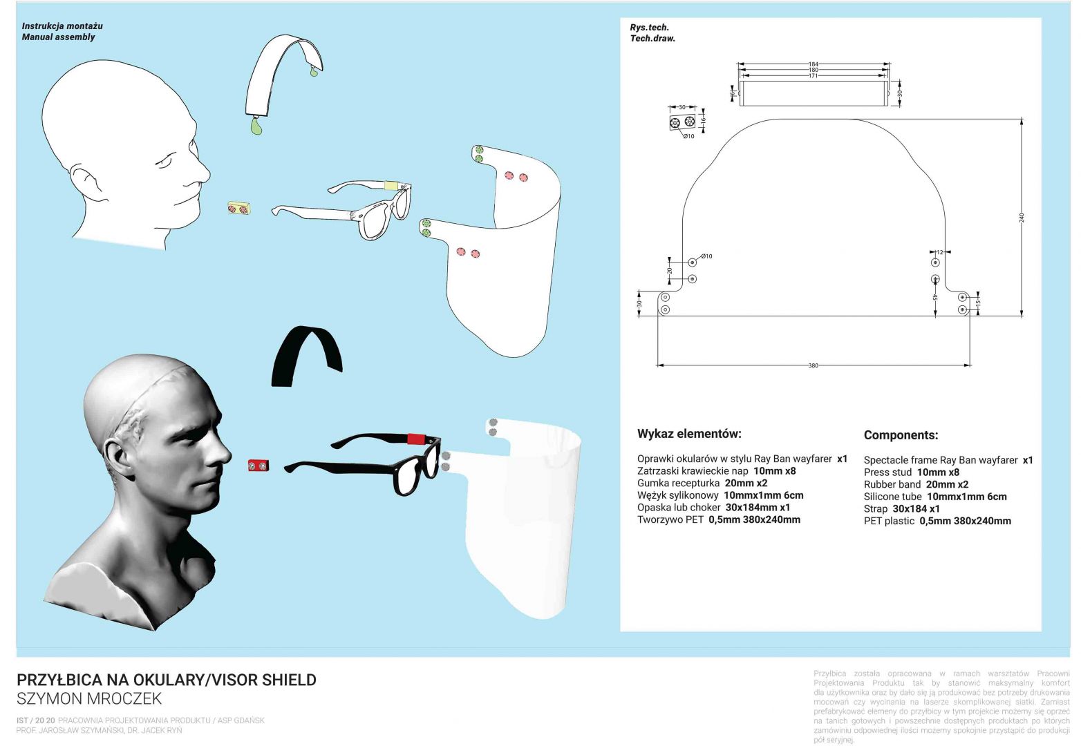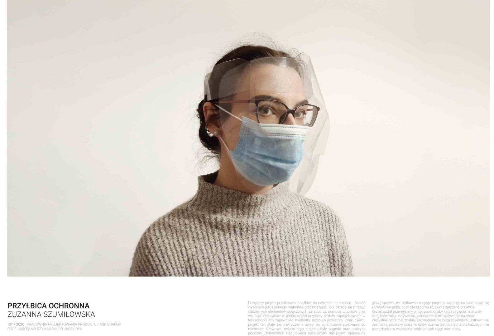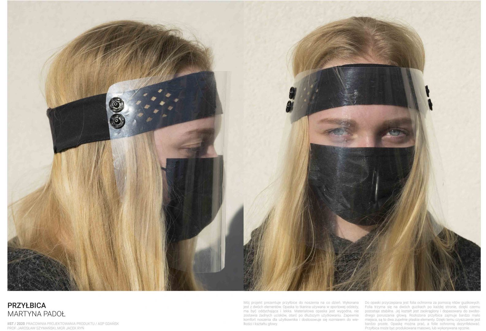 Obecna sytuacja na świecie i w kraju oraz przejście na nauczanie w trybie online otwiera przed nami nowe możliwości. Staramy się być elastyczni i reagować na otaczającą nas rzeczywistość. Ostatnio nasi studenci studiów I stopnia podczas warsztatów w trybie online zaprojektowali przyłbice ochronne. Są to projekty otwarte „open source” do zastosowań niekomercyjnych. Projekty te zostały zrealizowane w pracowni projektowania produktu prowadzonej przez prof. Jarosława Szymańskiego oraz dra Jacka Rynia (Katedra Projektowania Produktu i Usług).