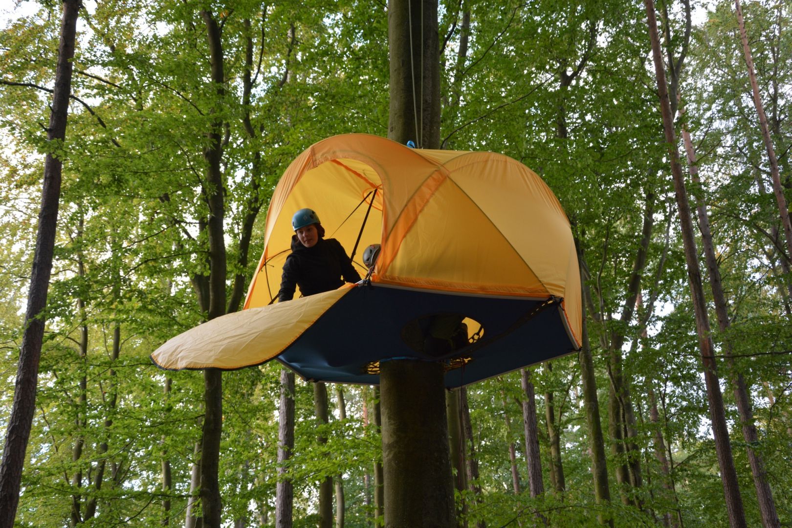 Nocleg wysoko na drzewie bez użycia technik alpinistycznych. Czy to możliwe? Dla kogo takie schronienie mogłoby okazać się użyteczne? Na te pytania i wiele innych, postanowiłem odpowiedzieć w mojej pracy magisterskiej, a następnie skonstruować model, według założeń sformułowanych na bazie tych odpowiedzi. Z takiego rozwiązania skorzystaliby przede wszystkim fotografowie przyrody i jej obserwatorzy np. ornitolodzy, ale również zwykli turyści pragnący przeżyć wyjątkową przygodę. Użytkownik ma możliwość zawiesić namiot i się do niego bezpiecznie dostać bez konieczności uczestnictwa w kursach wspinaczkowych/wysokościowych. Sztywność platformy daje solidne oparcie, zapewniające komfort przebywania na wysokości, co wraz z pokryciem namiotu – tropikiem, umożliwia dyskretne fotografowanie zwierząt oraz nocowanie wysoko na drzewie.