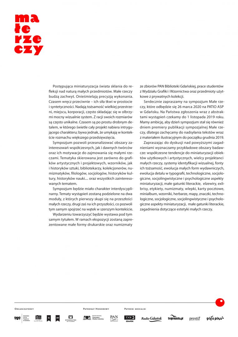 Mamy ambicję, aby dzień sympozjum stał się również dniem premiery publikacji sympozjalnej „Małe rzeczy”, dlatego zachęcamy do nadsyłania tekstów wraz z materiałem ilustracyjnym do początku grudnia 2019.