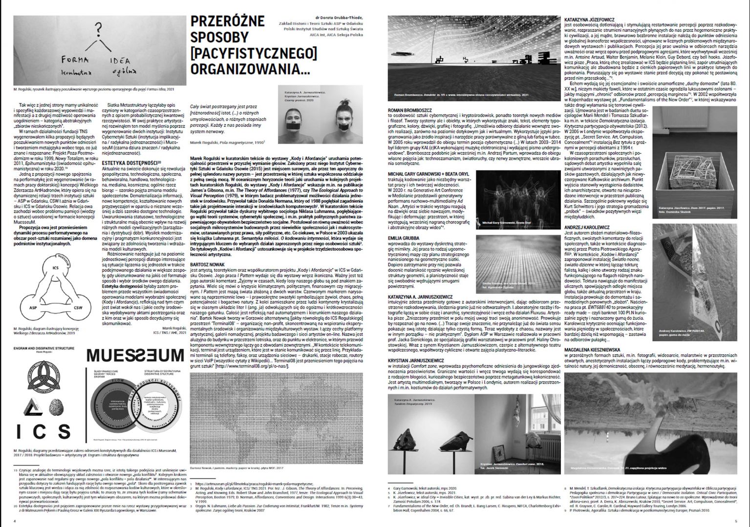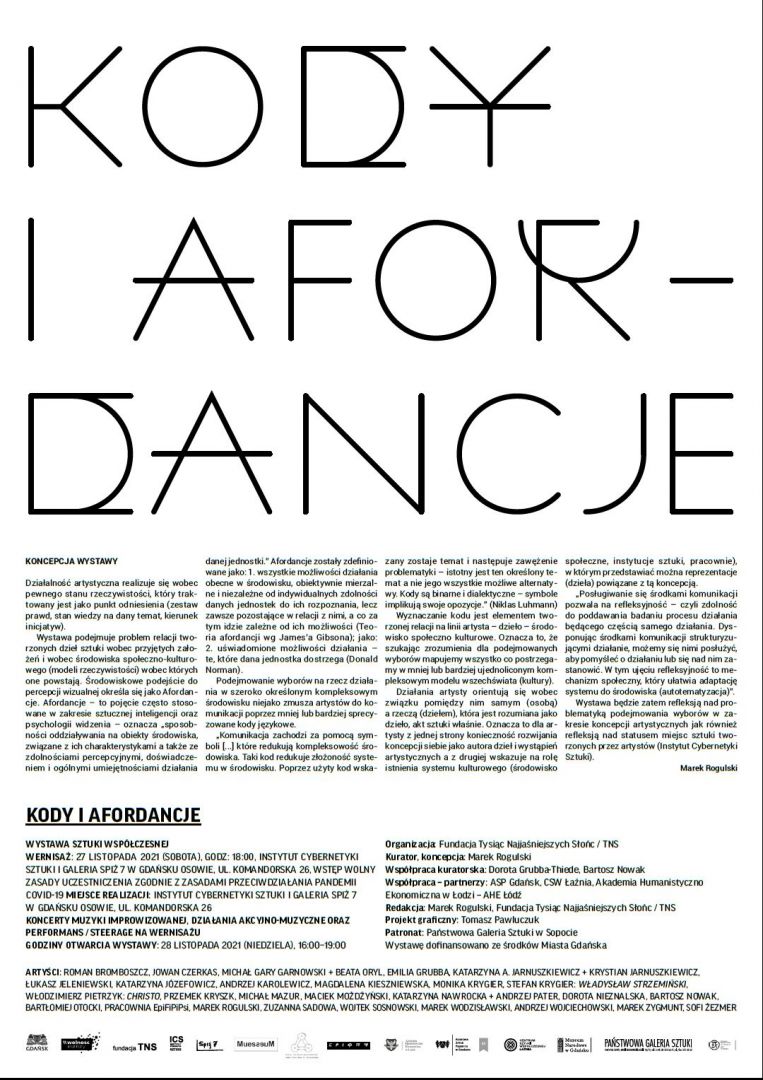 Afordancje -- to pojęcie często stosowane w zakresie sztucznej inteligencji oraz psychologii widzenia – oznacza „sposobności oddziaływania na obiekty środowiska, związane z ich charakterystykami a także ze zdolnościami percepcyjnymi, doświadczeniem i ogólnymi umiejętnościami działania danej jednostki.” Afordancje zostały zdefiniowane jako: 1. wszystkie możliwości działania obecne w środowisku, obiektywnie mierzalne i niezależne od indywidualnych zdolności danych jednostek do ich rozpoznania, lecz zawsze pozostające w relacji z nimi, a co za tym idzie zależne od ich możliwości (Teoria afordancji wg. James'a Gibsona); jako: 2. uświadomione możliwości działania – te, które dana jednostka dostrzega. (Donald Norman). Podejmowanie wyborów na rzecz działania w szeroko określonym kompleksowym środowisku niejako zmusza artystów do komunikacji poprzez mniej lub bardziej sprecyzowane kody językowe. „Komunikacja zachodzi za pomocą symboli [...] które redukują kompleksowość środowiska. Taki kod redukuje złożoność systemu w środowisku. Poprzez użyty kod wskazany zostaje temat i następuje zawężenie problematyki – istotny jest ten określony temat a nie jego wszystkie możliwe alternatywy. Kody są binarne i dialektyczne – symbole implikują swoje opozycje.” (Niklas Luhmann). Wyznaczanie kodu jest elementem tworzonej relacji na linii artysta – dzieło – środowisko społeczno- kulturowe. Oznacza to, że szukając zrozumienia dla podejmowanych wyborów mapujemy wszystko co postrzegamy w mniej lub bardziej ujednoliconym kompleksowym modelu wszechświata (kultury). Działania artysty orientują się wobec związku pomiędzy nim samym (osobą) a rzeczą (dziełem), która jest rozumiana jako dzieło, akt sztuki właśnie.Oznacza to dla artysty z jednej strony konieczność rozwijania koncepcji siebie jako autora dzieł i wystąpień artystycznych a z drugiej wskazuje na rolę istnienia systemu kulturowego (środowisko społeczne, instytucje sztuki, pracownie), w którym przedstawiać można reprezentacje (dzieła) powiązane z tą koncepcją. „Posługiwanie się środkami komunikacji pozwala na refleksyjność – czyli zdolność do poddawania badaniu procesu działania będącego częścią samego działania. Dysponując środkami komunikacji strukturyzującymi działanie, możemy się nimi posłużyć, aby pomyśleć o działaniu lub się nad nim zastanowić. W tym ujęciu refleksyjność to mechanizm społeczny, który ułatwia adaptację systemu do środowiska (autotematyzac). Wystawa będzie zatem refleksją nad problematyką podejmowania wyborów w zakresie koncepcji artystycznych jak również refleksją nad statusem miejsc sztuki tworzonych przez artystów (Instytut Cybernetyki Sztuki)”. Marek Rogulski ICS/TNS 2021