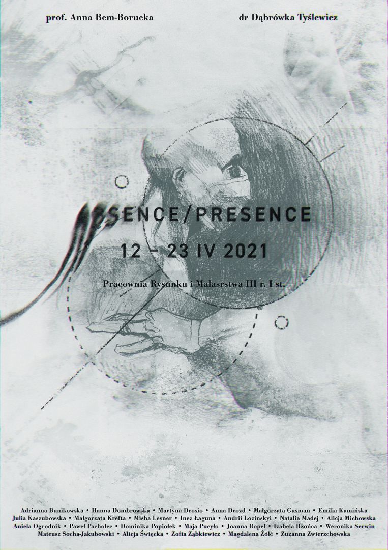 Wystawa absence/ presence przedstawia prace wykonane w roku akademickim 2020/ 2021 przez studentów III r. I st. w III Pracowni Rysunku i Malarstwa, na Wydziale Grafiki.