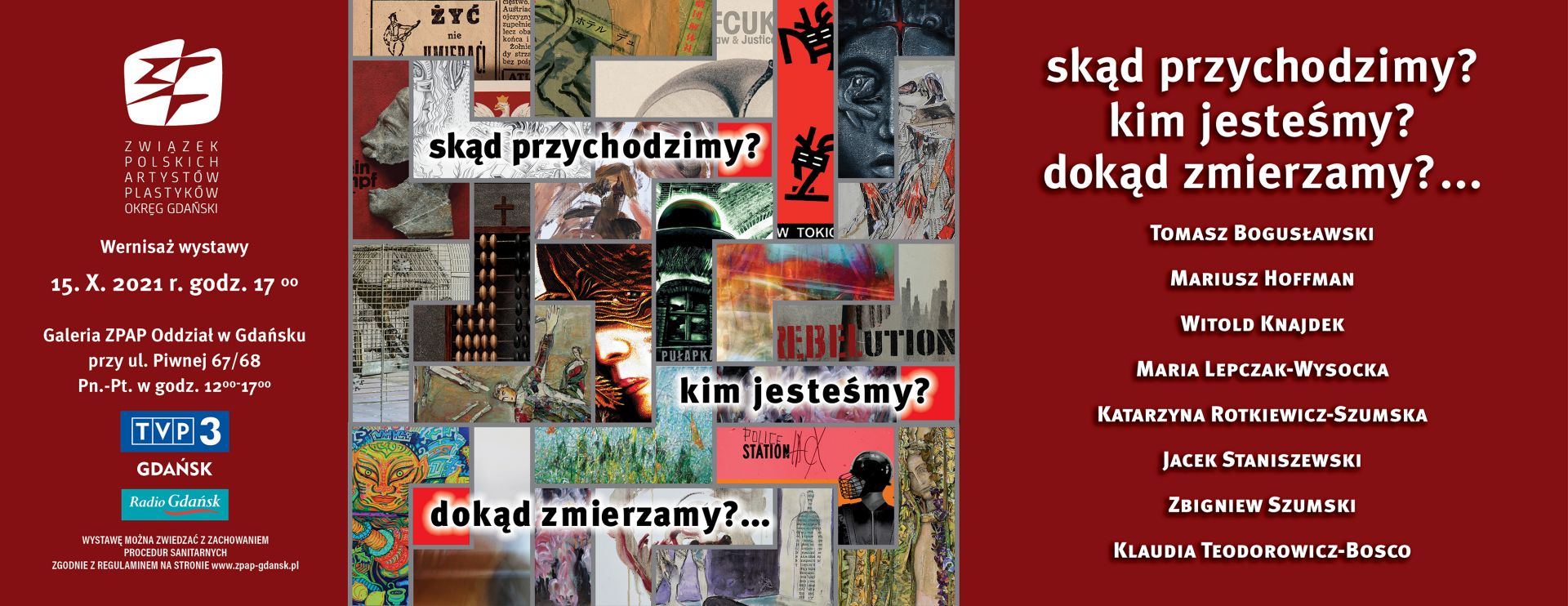 skąd przychodzimy? kim jesteśmy? dokąd zmierzamy?… To tytuł zbiorowej wystawy twórców, absolwentów ASP w Gdańsku – Wydziału Malarstwa i Grafiki lat 80-tych. Każda z ośmiu osób podążała własną drogą twórczą realizując swoje rozumienie sztuki. Niewątpliwie bardzo ciekawe jest spojrzenie na zestawienie tych osobowości obok siebie. Dostrzegając różnice, a być może i podobieństwa, będą mogli Państwo sami ocenić specyfikę rozumienia i tworzenia sztuki przez każdą z indywidualności, których prace są pokazywane na tej wystawie. Tytuł wystawy i jednocześnie jej motto, to pytanie zaczerpnięte z obrazu Paula Gauguina a odnoszące się do tego, jak czasy i wydarzenia determinują twórczość. Ta wystawa, to doskonałe miejsce aby zadać to filozoficzne pytanie i przyjrzeć się w jaki sposób każda z uczestniczek wystawy i każdy z jej uczestników zmierza do swoich artystycznych celów, czy to w warstwie merytorycznej, czy artystycznych środków wyrazu.
