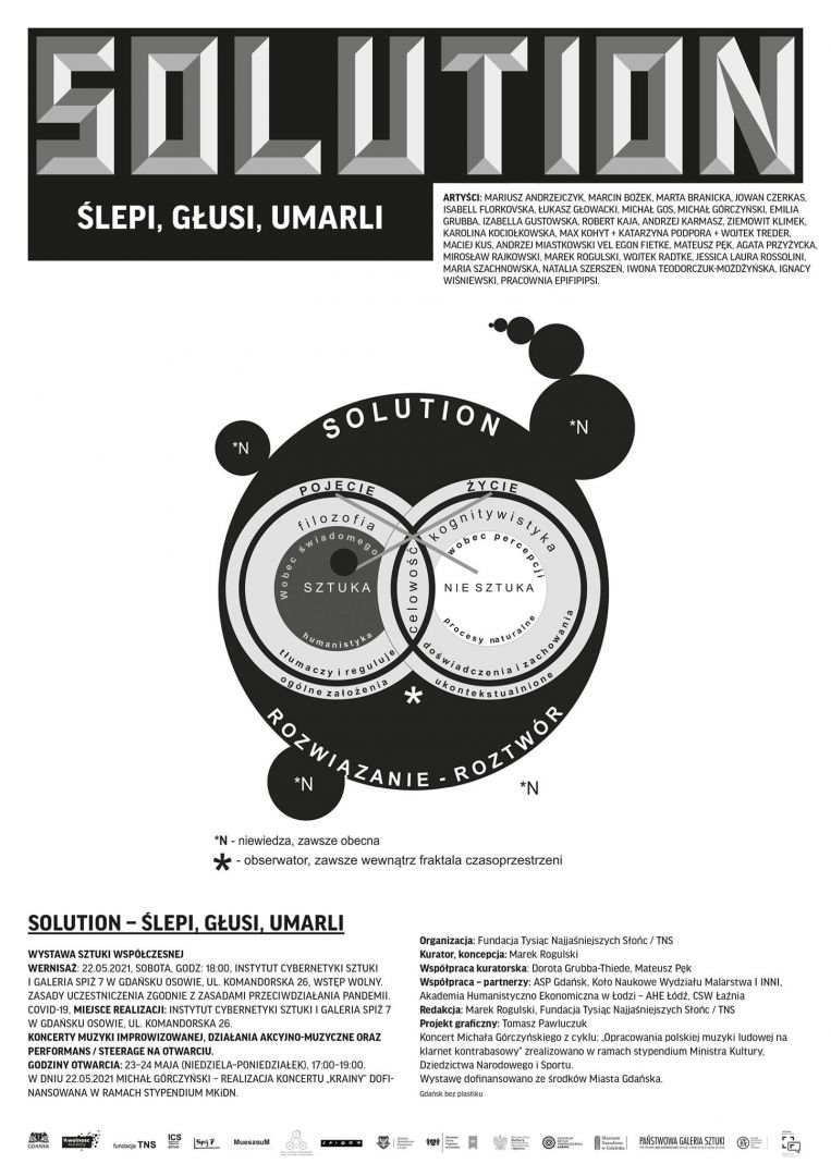 Angielskie słowo „Solution” oznacza rozwiązanie (odpowiedź na problem) ale także i roztwór, rozłączenie. Działalność artystyczna mierzyć się musi z trudnościami natury psychologicznej i epistemologicznej.