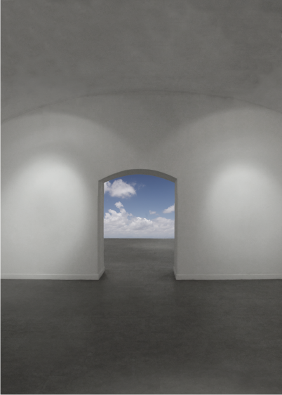 [grafika – Zdjęcie wnętrza galerii z białymi ścianami i szarą podłogą. W centrum przejście do drugiej sali, z zaokrągloną górną krawędzią. W miejscu, gdzie powinna być ściana następnego pomieszczenia widok na niebo z chmurami.]