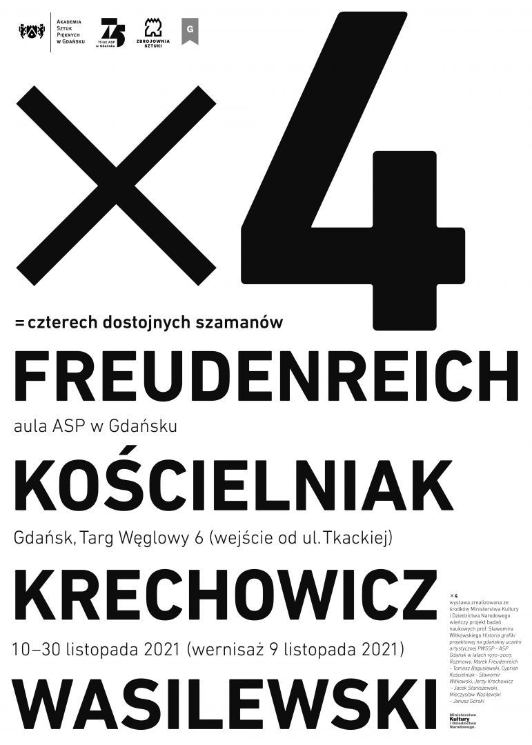 Katedra Grafiki Projektowej w gdańskiej Państwowej Wyższej Szkole Sztuk Plastycznych była częścią Wydziału Malarstwa, a od czasu, gdy ponad dziesięć lat temu powołany został Wydział Grafiki (już pod egidą Akademii Sztuk Pięknych), stanowi jego podporę. Uczyli w niej wybitni graficy: Marek Freudenreich (razem z nieżyjącym już Witoldem Janowskim tworzyli nierozłączną parę), Cyprian Kościelniak, który zastąpił Freudenreicha, gdy ten wyjechał uczyć projektowania graficznego Austriaków, i kolejny absolwent warszawskiej asp – Mieczysław Wasilewski (Kościelniak i Wasilewski przyjechali do Gdańska opromienieni sławą asystentów Henryka Tomaszewskiego). No i Jerzy Krechowicz, współtwórca kierunku grafiki projektowej na gdańskiej uczelni artystycznej, jej dobry duch i nauczyciel akademicki o najdłuższym stażu. Wystawa, na której otwarcie zapraszamy 9 listopada 2021 roku o godzinie 18 do auli asp w Gdańsku, stanowi podsumowanie niecodziennego projektu wydawniczego zatytułowanego 1 x 1: Jego idea polegała na tym, by czterech profesorów Katedry Grafiki przeprowadziło rozmowy z czterema swoimi poprzednikami. I tak Tomasz Bogusławski rozmawiał z Markiem Freudenreichem, Sławomir Witkowski z Cyprianem Kościelniakiem, Jacek Staniszewski z Jerzym Krechowiczem, a Janusz Górski z Mieczysławem Wasilewskim. Zarówno cztery bogato ilustrowane tomy, które stanowią rezultat tego projektu, jak i wystawa x 4 potwierdzają mistrzostwo czterech dostojnych szamanów.