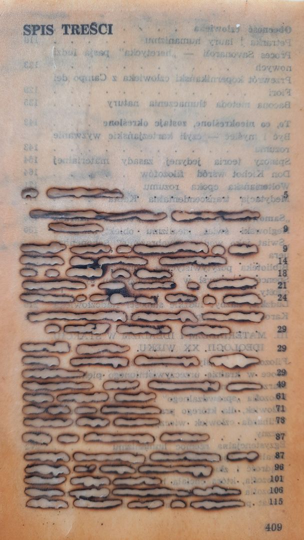 | spis treści | pirografia, wosk, technika mieszana, format książkowy|2021r.