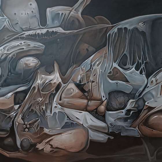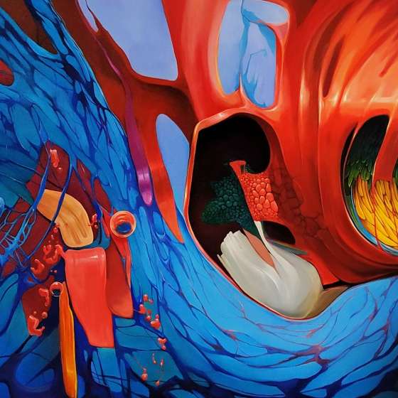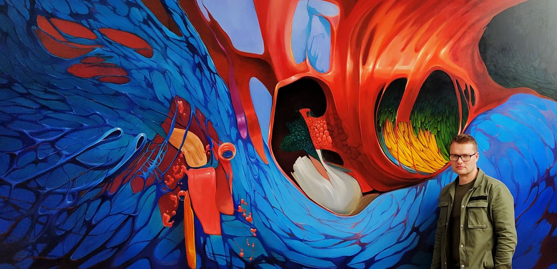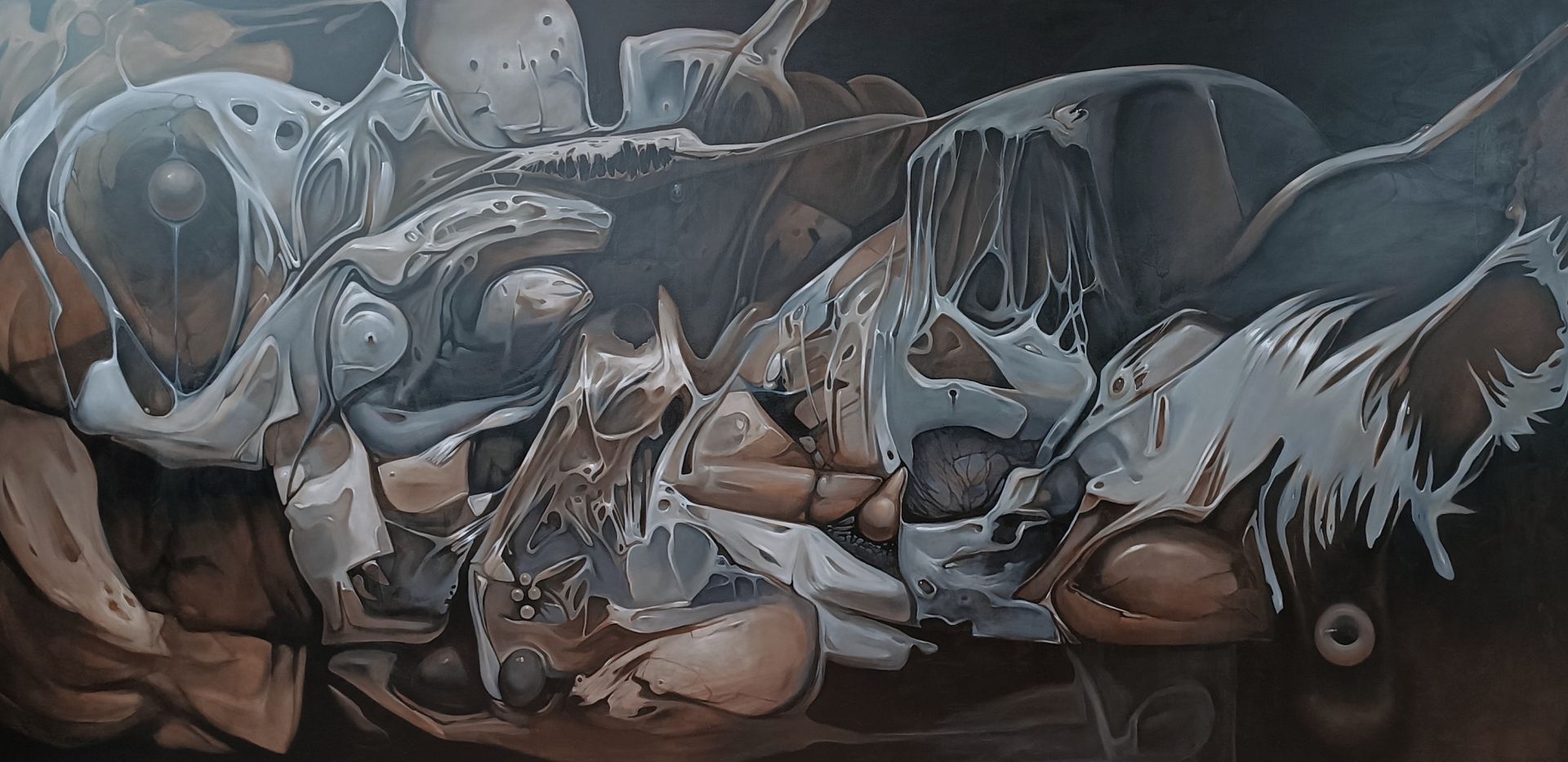 Pierwszy obraz malowałem na początku 2021 roku podczas pandemii. Od dłuższego czasu miałem pomysł, żeby namalować obraz pełen emocji i ekspresji, w pełni oddać się gestowi i być wolnym od przygotowań w postaci szkicu. Odwagi dodały mi okoliczności, które pozwoliły mi skupić się na podświadomości. To był magiczny medytacyjny stan, który pojawia się podczas relacji z kolorami na płótnie. Ważnym elementem jest rysunek, porządkowanie powstałych w sposób ekspresyjny przypadkowy form. Niepewność jutrzejszego dnia, strach przed chorobą oraz nadzieja, że niedługo to się skończy. Na moje emocje miało wpływ również doświadczenie odseparowania podczas lockdowna. Może dlatego pierwszy obraz ma w sobie dużą dawkę intensywnych, przeciwstawnych kolorów. Budowała go moja tłumiona energia, która domagała się ujawnienia.