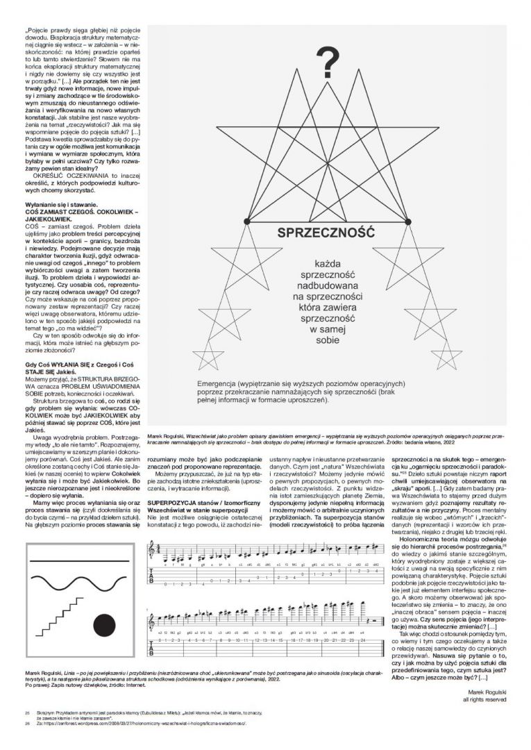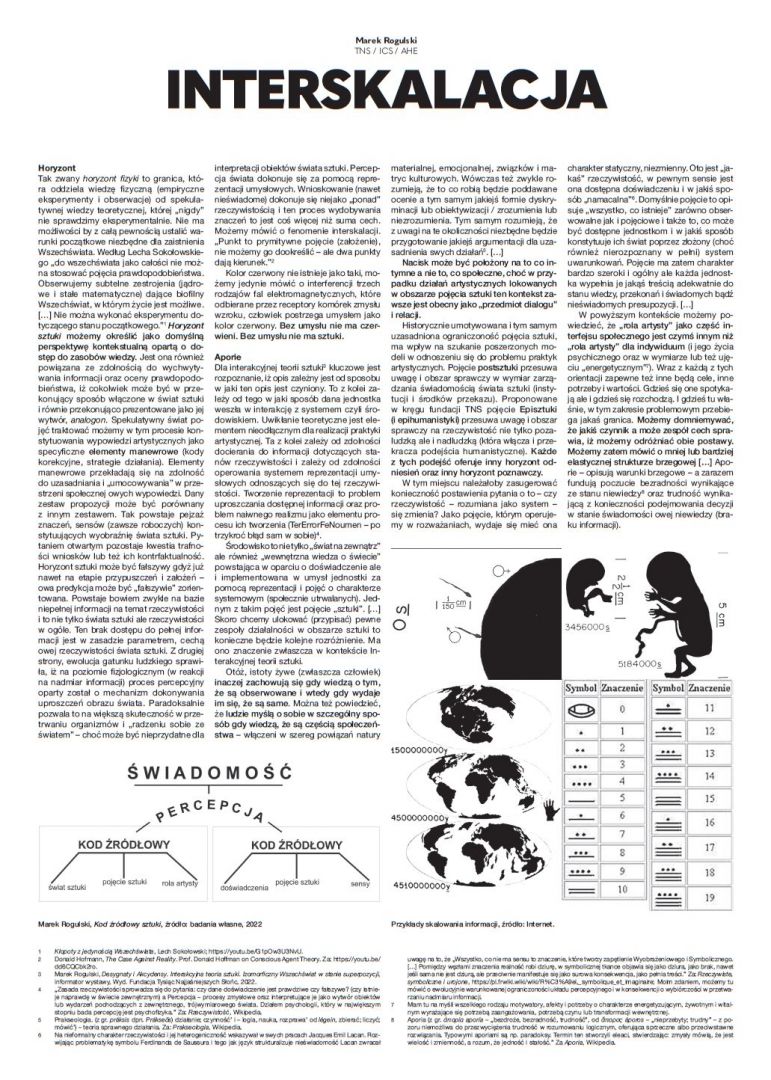 "Aby móc zaprojektować na przykład most trzeba umieć przewidzieć wyzwania. Od tego zależy czy podjęte zostaną właściwe decyzje. Jeśli chcemy widzieć w działalności artystycznej jakąś zdolność do sprawczego wpływania na rzeczywistość (np.: społeczną) to jaki wówczas zakładamy horyzont myślowy, badawczy i jak jest on osadzony w czasie? Innymi słowy należy starać się odpowiedzieć na pytanie czy mamy wystarczającą perspektywę aby uchwycić odpowiedni horyzont, zdefiniować wyzwania, przewidzieć konsekwencje działań? A przynajmniej określić czy dysponujemy odpowiednią perspektywą aby określić w jakim stopniu ów zakładany horyzont jest fałszywy – gdyż „niekompletny”? Fałszywy w tym sensie, że z uwagi na nasze ograniczenia poznawcze i ograniczony zasób wiedzy ma on charakter względny, zmienny, roboczy... Pojęcie interskalacji oznacza z kolei, iż mówimy o czymś więcej niż tylko o sumie cech. W przypadku działalności artystycznej łączy się wymiar cech wieloaspektowego doświadczenia indywidualnego, społecznego, zarazem problemu estetyki, języka, określania i zarazem przekraczania granic poznawczych. „Rzeczywistość, świat jaki znamy jest tylko opisem. Jest nieskończonym nurtem interpretacji postrzegania zmysłowego, który my, jednostki dzielące szczególną przynależność grupową, nauczyliśmy się jednomyślnie. W momencie, w którym jednostka zaczyna opisywać rzeczywistość, jej postrzeganie zostaje owym opisem ograniczone.” (Ken Wilber,) W naukach socjologicznych tzw. imperatywizm funkcjonalny stanowi, iż systemy ludzkiego działania charakteryzują się czterema rodzajami problemów (imperatywów) wiążących się z ich przetrwaniem. Są to: adaptacja, osiąganie celów, integracja i kultywowanie wzorów. W działalności artystycznej podejmujemy jednak wysiłek aby owe wzory kulturowe przełamywać. I dopiero rozbieżności między teorią (założeniami) a praktycznym doświadczeniem artystycznym mogą dać jakiś wynik.Teoria staje się odkryciem gdy „działa”. Jednak z powyższego stwierdzenia wynika konstatacja, iż rzeczywista energia dzieła sztuki nie tkwi ani w założeniach teorii ani w praktycznym działaniu je potwierdzającym ale raczej w zdolności ujawniania rozbieżności pomiędzy tymi dwiema składowymi „równania”. Być może z tej rozbieżności pozyskać możemy jakąś informację istotną dla formułowania kolejnych „zadań” w obszarze sztuki".