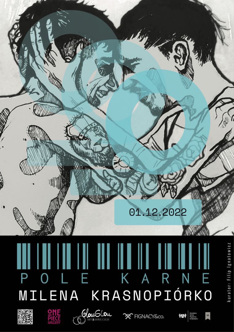 POLE KARNE to pokaz sześciu odbitek stworzonych przy pomocy kamienia litograficznego jako aneks zrealizowany w pracowni dr-a Łukasza Butowskiego pod tytułem The Beautiful Game, jednak tutaj w kolejnej drukarskiej reprezentacji tak by jeszcze bardziej podbić ich możliwy plakatowy charakter. Od pokazu dyplomowego Mileny Krasnopiórko na Wydziale Malarstwa minęło prawie pół roku, jednak pojawia się niezwykły kontekst i niestety smutny powód, by wrócić do tych realizacji. Na pierwszy rzut oka wydawać by się mogło, że chodzi tu tylko o piłkę nożną i międzynarodowe święto tego sportu, które właśnie obchodzimy, jednak to raptem wierzchołek góry lodowej. Konstrukcja prezentowanego cyklu prac zakłada bowiem dobór natywnych kolorów przedstawionych drużyn w taki sposób, by finalnie barwy te stały się rodzajem tęczy. Tęczy, która jest absolutnie zakazanym symbolem na obecnych mistrzostwach piłkarskich w Katarze, a o której zrobiło się głośno w momencie kiedy kapitanowie zakwalifikowanych drużyn zostali zaszantażowani ewentualnymi żółtymi kartkami, tak by mieć pewność, że nie wejdą oni na murawę z opaskami promującymi równość. Ten kontekst jest idealnym pretekstem, by przypomnieć statement, który ukryty jest w realizacji Krasnopiórko pod sprytnym tytułem wystawy POLE KARNE- bardzo jasno odwołującym się do otwartych i homofobicznych działań względem społeczności lgbt. Warto też wspomnieć, że przedstawienia widoczne na prezentowanych grafikach zatrzymują się w bardzo celnie uchwyconych i niejednoznacznych momentach, kiedy to herosi naszych czasów- piłkarze, za pomocą zdeformowanej kreski przedstawieni są w tej milisekundzie radości, braterstwa czy totalnego maczyzmu, która jednocześnie może być podszyta cielesną fascynacją i napięciem quasi-homoerotycznym. Zatem pokaz staje się teraz czymś w rodzaju site-specific, a może time-specific, tym bardziej, że w gościnnej przestrzeni, w której funkcjonuje ONE PIECE GALLERY na moment mundialu pojawiają się właśnie transmisje meczów ze wspomnianych mistrzostw.