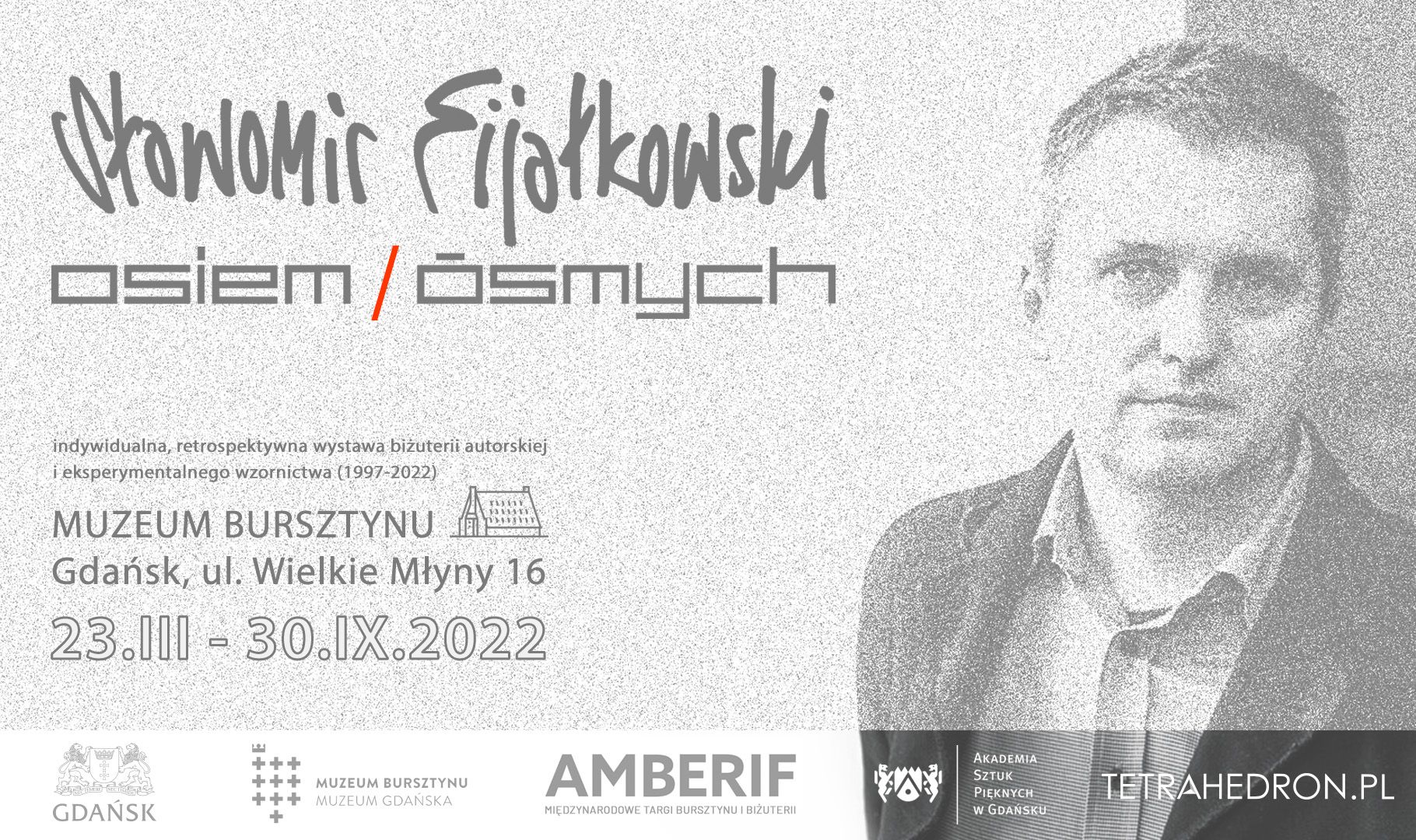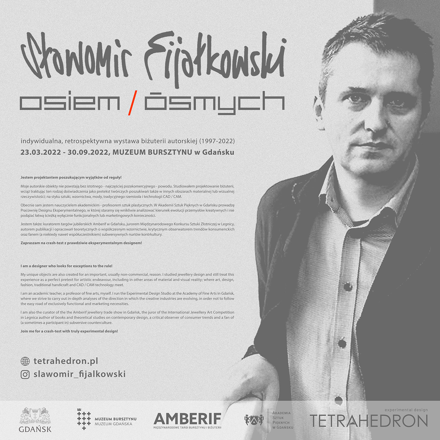 Osiem Ósmych to pierwsza w Trójmieście retrospektywna, indywidualna wystawa autorskiej biżuterii Sławomira Fijałkowskiego – obejmująca okres 1997-2022. Autor jest profesorem sztuk plastycznych w Akademii Sztuk Pięknych w Gdańsku gdzie na Wydziale Architektury i Wzornictwa prowadzi Pracownię Designu Eksperymentalnego, obejmującą również projektowanie biżuterii. Oprócz działalności dydaktycznej Sławomir Fijałkowski znany jest z wielu aktywności promujących współczesne wzornictwo – jako autor publikacji Trend Book, kurator Międzynarodowych Targów Bursztynu i Biżuterii AMBERIF w Gdańsk, juror i konsultant artystyczny Międzynarodowego Konkursu Sztuki Złotniczej w Legnicy, pomysłodawca ważnych wystaw, autor tekstów, inspirator działań, w których centrum pozostaje bałtycki bursztyn, ale także projektant współpracujący z wiodącymi firmami jubilerskimi.