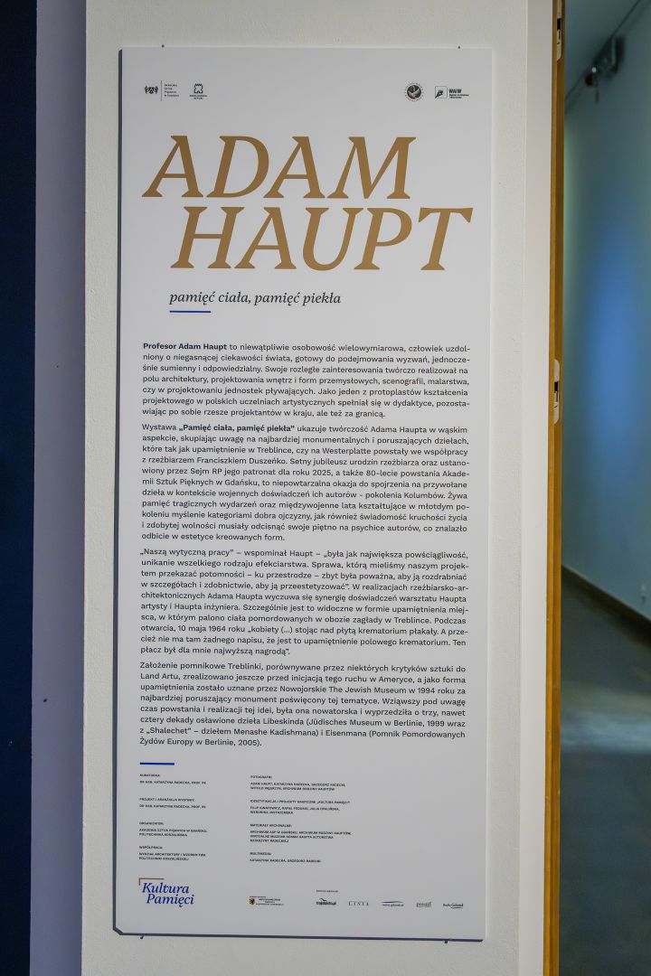 Wystawa „Pamięć ciała, pamięć piekła” ukazuje twórczość Adama Haupta w wąskim aspekcie, skupiając uwagę na najbardziej monumentalnych i poruszających dziełach, które tak jak upamiętnienie w Treblince, czy na Westerplatte powstały we współpracy z rzeźbiarzem Franciszkiem Duszeńko. Setny jubileusz urodzin rzeźbiarza oraz ustanowiony przez Sejm RP jego patronat dla roku 2025, a także 80-lecie powstania Akademii Sztuk Pięknych w Gdańsku, to niepowtarzalna okazja do spojrzenia na przywołane dzieła w kontekście wojennych doświadczeń ich autorów – pokolenia Kolumbów. Żywa pamięć tragicznych wydarzeń oraz międzywojenne lata kształtujące w młodym pokoleniu myślenie kategoriami dobra ojczyzny, jak również świadomość kruchości życia i zdobytej wolności musiały odcisnąć swoje piętno na psychice autorów, co znalazło odbicie w estetyce kreowanych form.