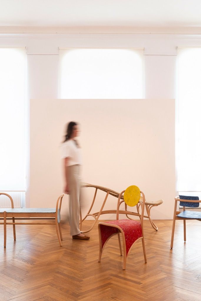 Nasze studentki wykonały meble w 100% własnoręcznie, wykorzystując materiały wtórne: odpady z produkcji mebli giętych firmy Paged Meble oraz przemielone nakrętki i butelki z polipropylenu, zebrane m.in. na ASP.