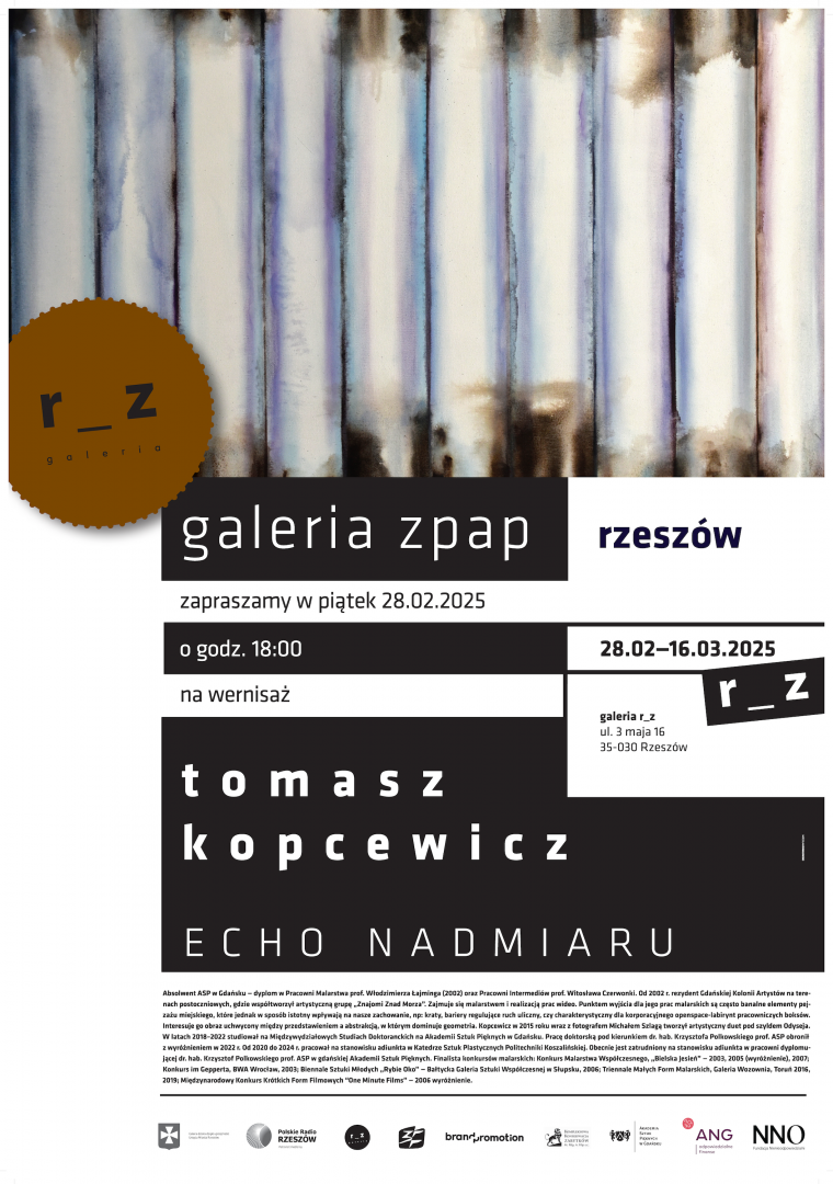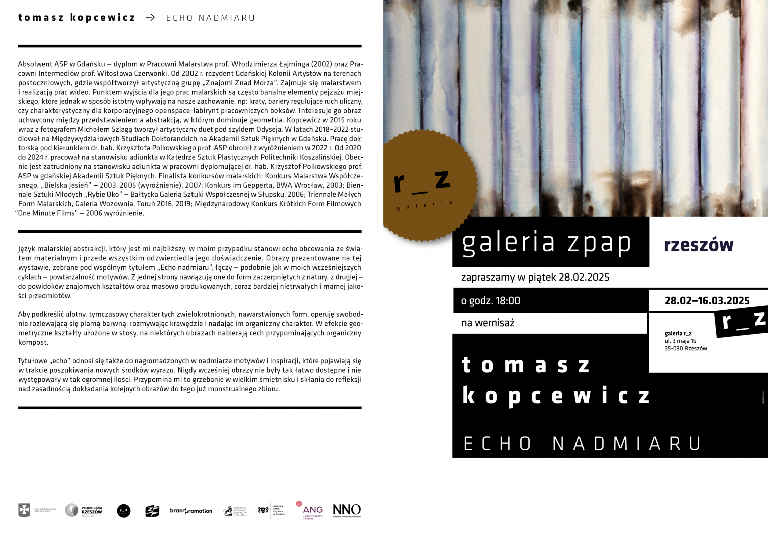 „Język malarskiej abstrakcji, który jest mi najbliższy, w moim przypadku stanowi echo obcowania ze światem materialnym i przede wszystkim odzwierciedla jego doświadczenie. Obrazy prezentowane na tej wystawie, zebrane pod wspólnym tytułem ,,Echo nadmiaru", łączy – podobnie jak w moich wcześniejszych cyklach – powtarzalność motywów. Z jednej strony nawiązują one do form zaczerpniętych z natury, z drugiej – do powidoków znajomych kształtów oraz masowo produkowanych, coraz bardziej nietrwałych i marnej jakości przedmiotów.