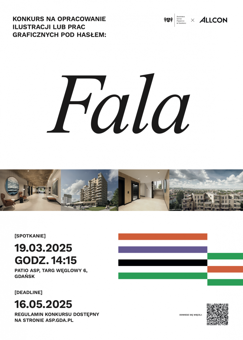 Akademia Sztuk Pięknych w Gdańsku oraz firma Allcon serdecznie zapraszają studentów gdańskiej ASP do udziału w konkursie na opracowanie ilustracji lub prac graficznych pod hasłem "FALA". Projekty będą dedykowane gdańskiej inwestycji SEAHall we Wrzeszczu i staną się częścią kolekcji sztuki INSPIRED by Allcon.