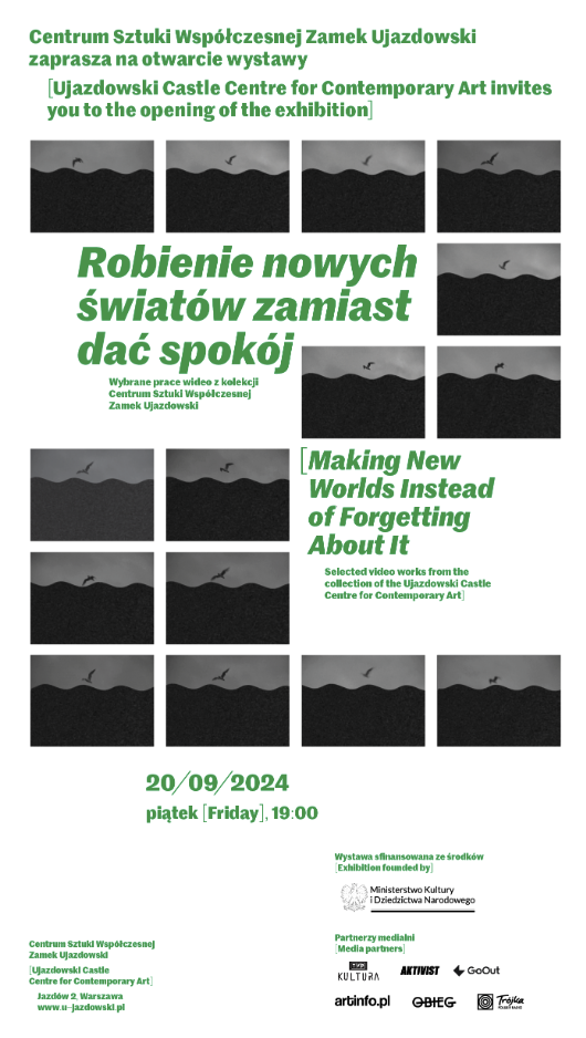 Na wystawie Robienie nowych światów zamiast dać spokój przedstawiamy ponad trzydzieści dzieł z lat 1973–2018, które stanowią trzon naszych zbiorów sztuki wideo. Zdecydowana większość to realizacje w technice wideo, ale są też utwory generowane komputerowo czy zapisane na tradycyjnej taśmie filmowej.