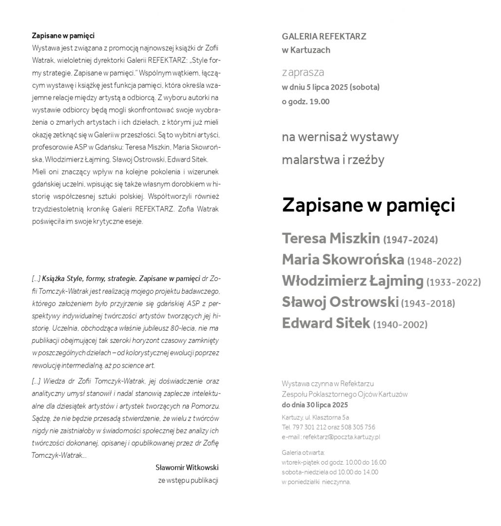 Wystawa jest związana z promocją najnowszej książki dr Zofii Watrak, wieloletniej dyrektorki Galerii REFEKTARZ: „Style formy strategie. Zapisane w pamięci.” Wspólnym wątkiem, łączącym wystawę i książkę jest funkcja pamięci, która określa wzajemne relacje między artystą a odbiorcą. Z wyboru autorki na wystawie odbiorcy będą mogli skonfrontować swoje wyobrażenia o zmarłych artystach i ich dziełach, z którymi już mieli okazję zetknąć się w Galerii w przeszłości. Są to wybitni artyści, profesorowie ASP w Gdańsku: Teresa Miszkin, Maria Skowrońska, Włodzimierz Łajming, Sławoj Ostrowski, Edward Sitek. Mieli oni znaczący wpływ na kolejne pokolenia i wizerunek gdańskiej uczelni, wpisując się także własnym dorobkiem w historię współczesnej sztuki polskiej. Współtworzyli również trzydziestoletnią kronikę Galerii REFEKTARZ.